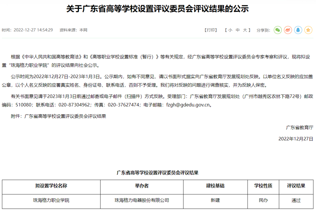 此前,广东省教育厅公示,拟新建珠海格力职业学院。