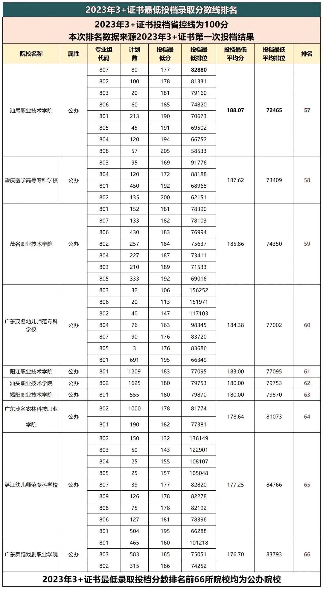 2023年3+证书公办专科共有66所