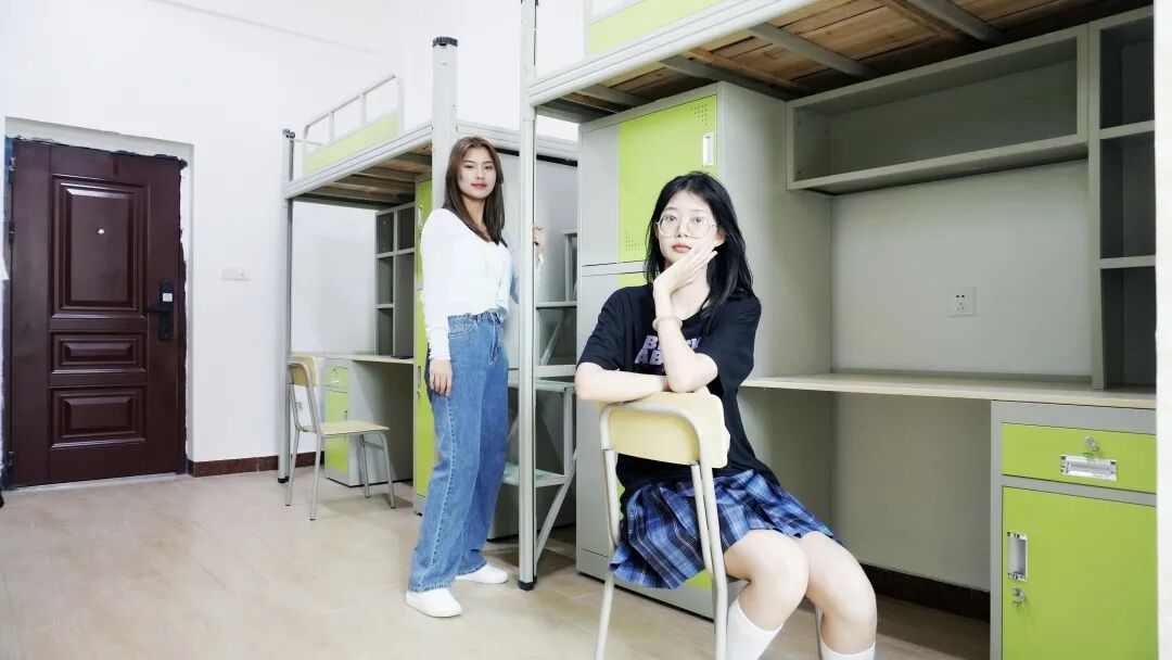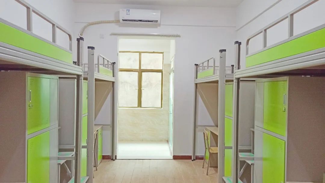 学校宿舍是上床下桌,标准四人间,有空调、洗衣机和独立卫浴。宿舍不限电、不规定时间熄灯,但考虑到安全问题所以限制大功率电器的使用。