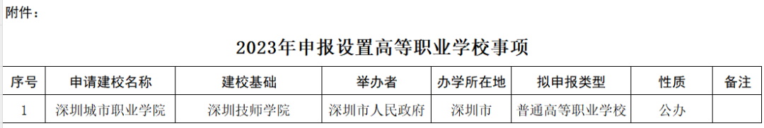 根据《中华人民共和国高等教育法》《高等职业学校设置标准(暂行)》《教育部关于“十四五”时期高等学校设置工作的意见》等有关规定,经广东省高等学校设置评议委员会专家考察和评议,现对深圳市人民政府申报以深圳技师学院为基础设立深圳城市职业学院事项予以公示。公示时间为2023年8月31日-2023年9月6日。