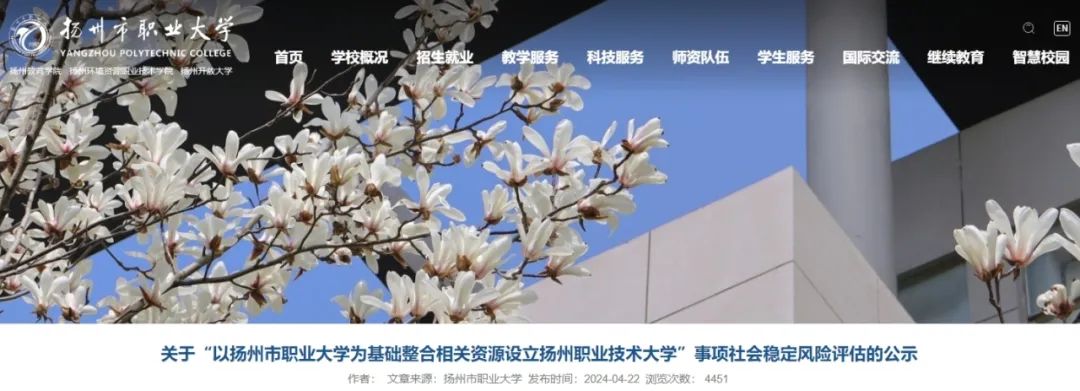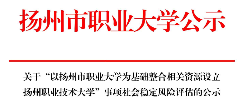 扬州市职业大学官网消息,关于“以扬州市职业大学为基础整合相关资源设立扬州职业技术大学”事项社会稳定风险评估的公示。