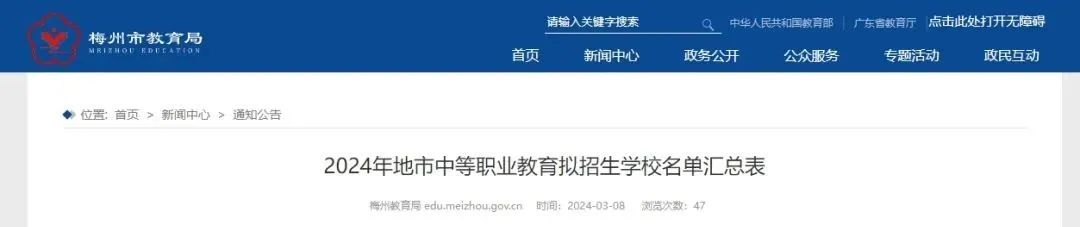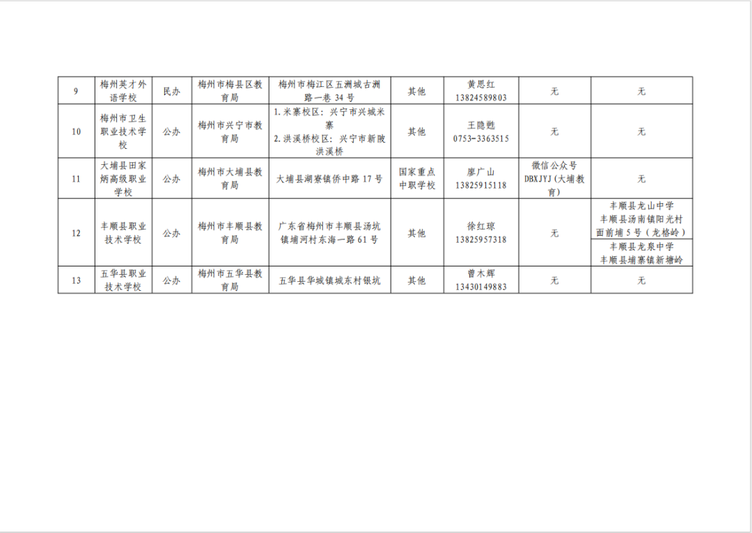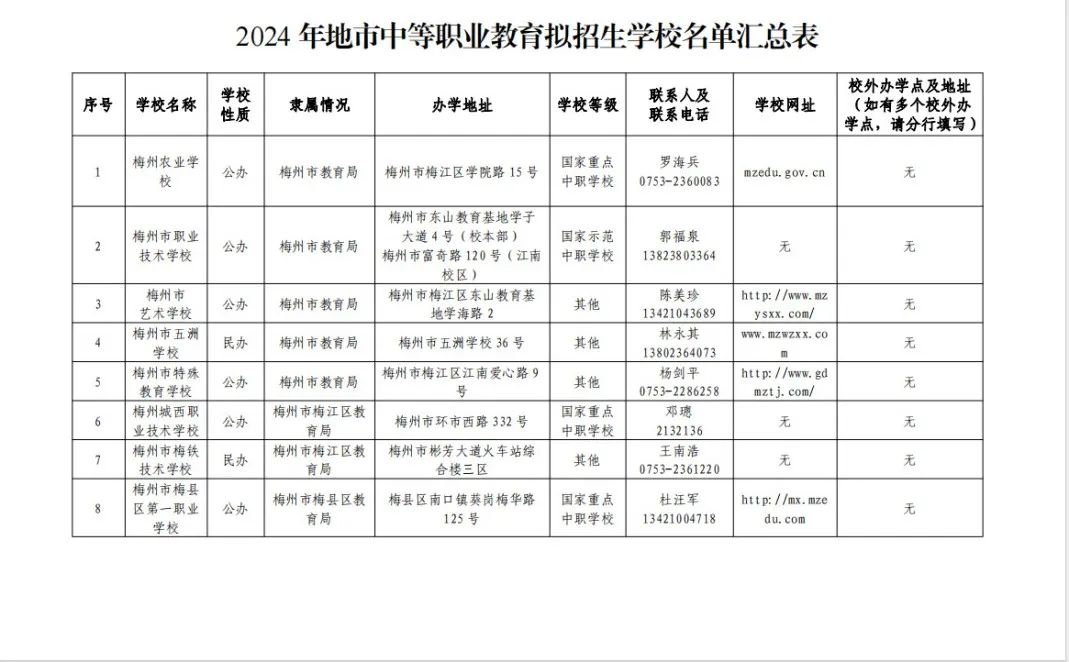 梅州市教育局2024年3月8日在网站上公布了《2024年地市中等职业教育拟招生学校名单汇总表》,梅州市一共有13所中职学校具备教育局认可的官方招生资格!