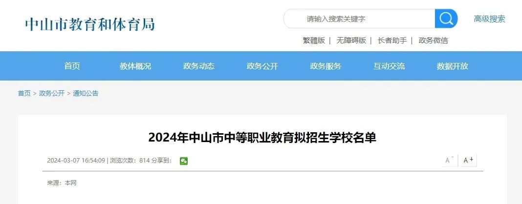 中山市教育和体育局2024年3月7日在网站上公布了《2024年中山市中等职业教育拟招生学校名单》。