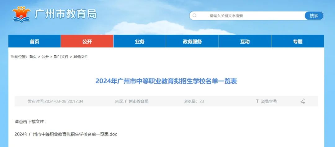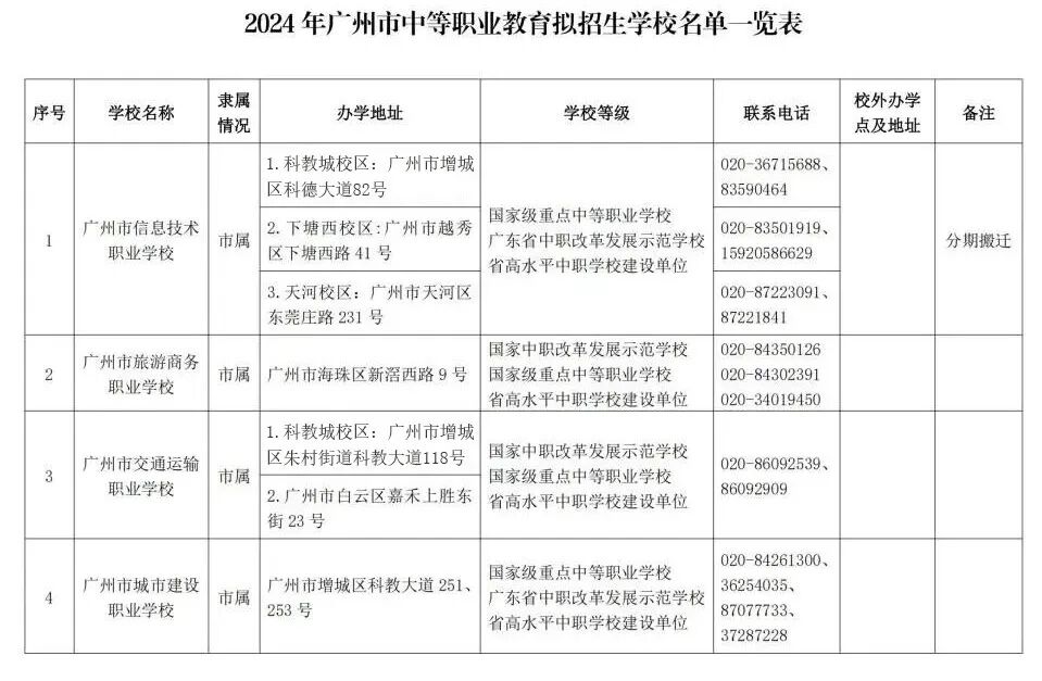 广州市教育局2024年3月8日在网站上公布了《2024年广州市中等职业教育拟招生学校名单一览表》。