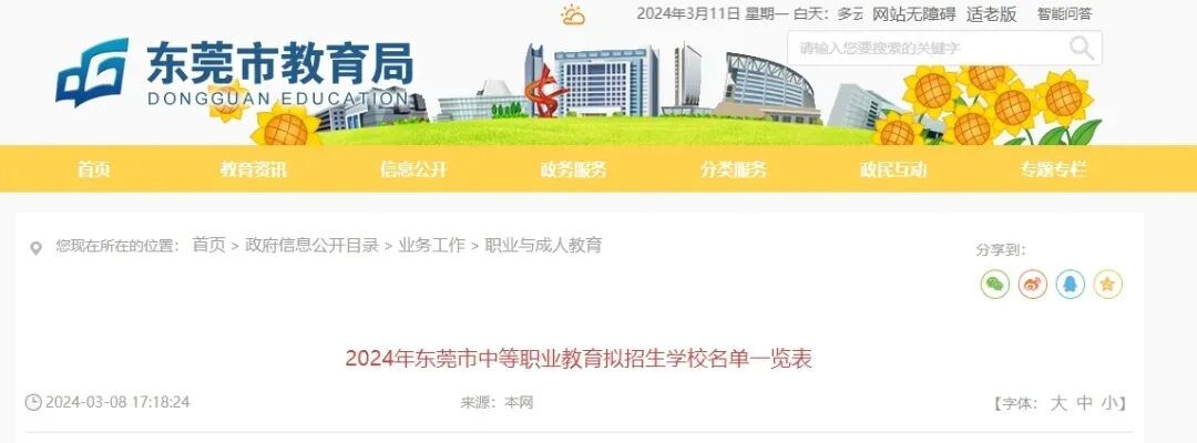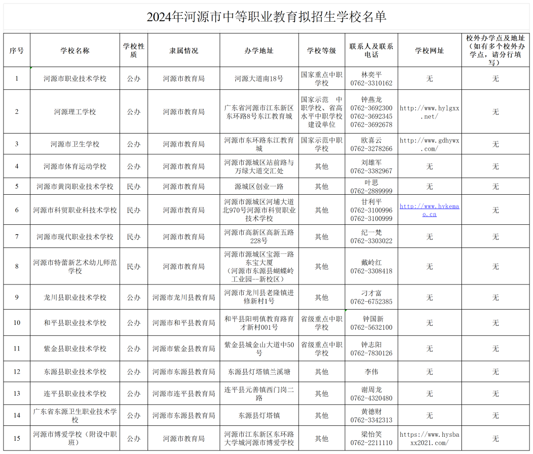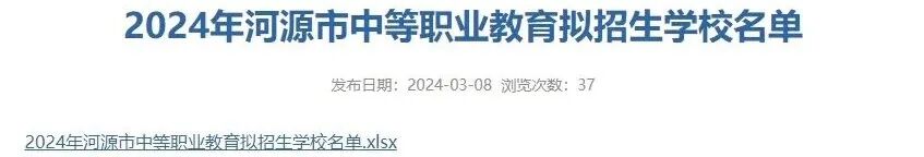 东莞市教育局2024年3月8日在官网上公布《2024年河源市中等职业教育拟招生学校名单》。