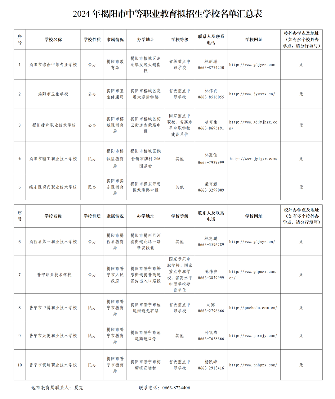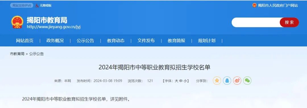 揭阳市教育局2024年3月8日在网站上公布了《2024年揭阳市中等职业教育拟招生学校名单》,揭阳市内一共有10所中学校具备教育局认可的官方招生资格。