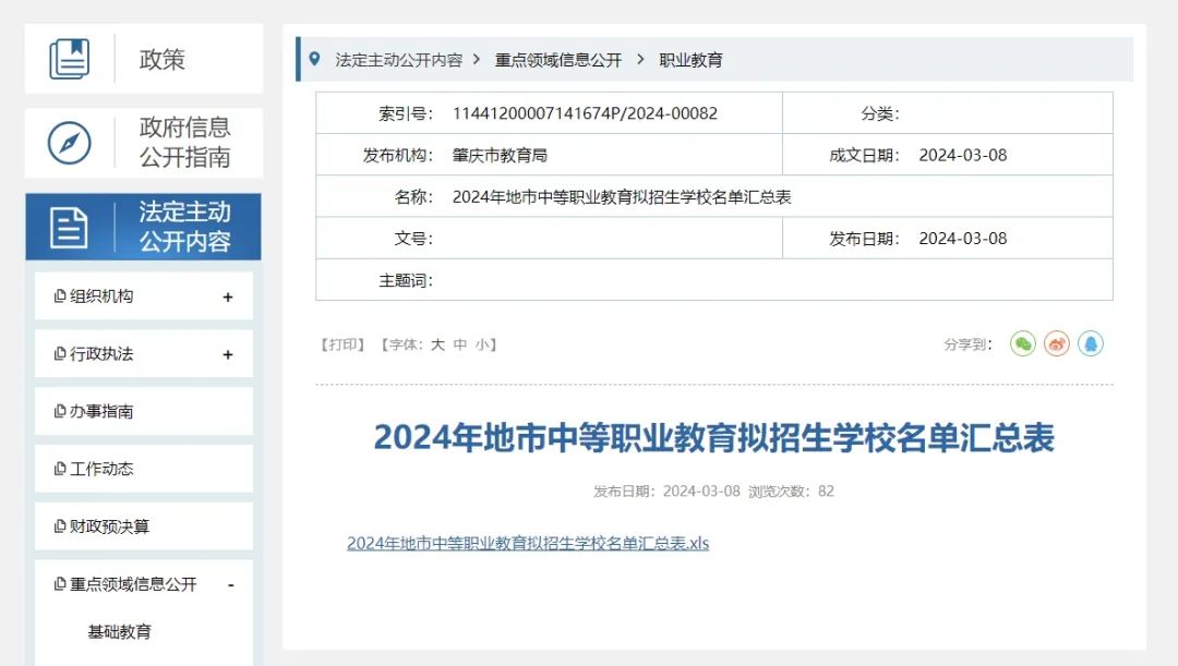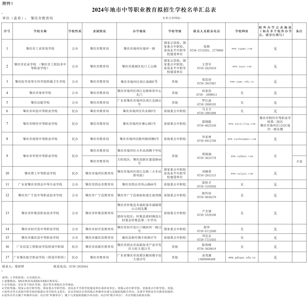 肇庆市教育局2024年3月8日在官网上公布《2024年地市中等职业教育拟招生学校名单汇总表》。