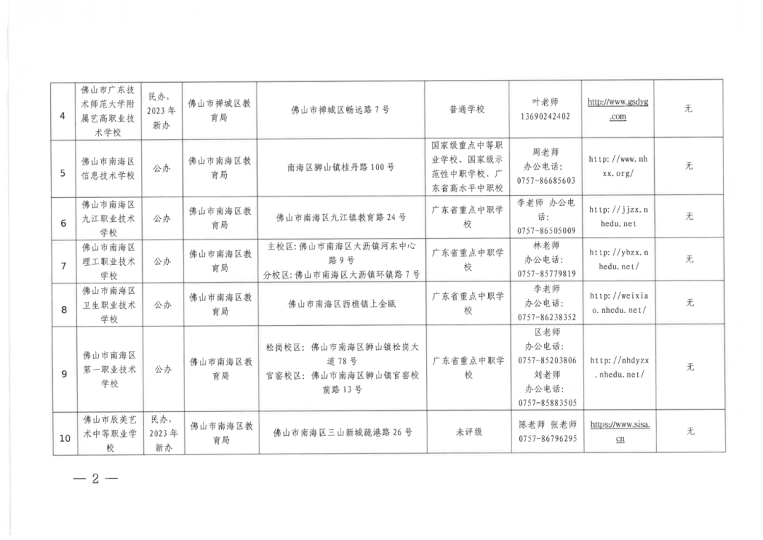 其中佛山市有23所公办院校。其余2所民办院校佛山市广东技术师范大学附属艺高职业技术学校和佛山市辰美艺术中等职业学校则是2023年新办学校.