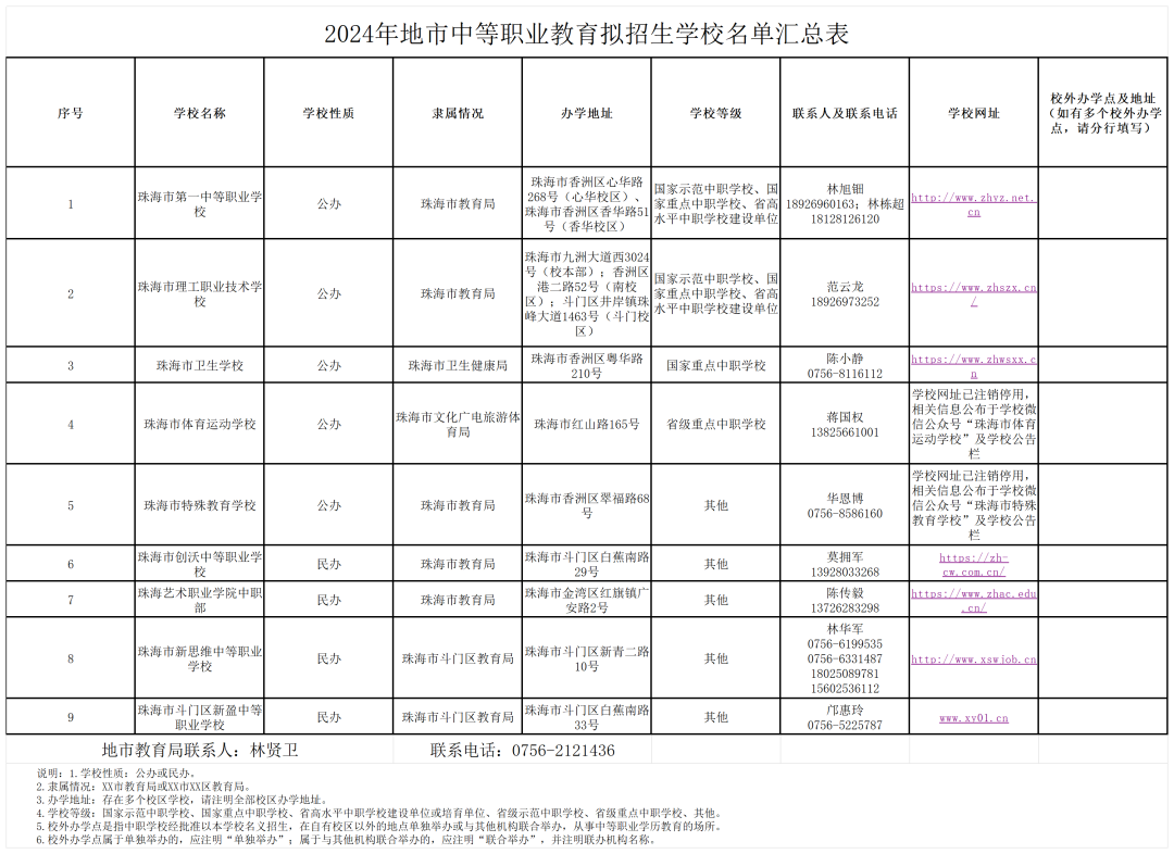 珠海市教育局2024年3月7日在网站上公布了《珠海市教育局关于2024年珠海市中等职业教育招生学校名单的通告》。珠海市内一共有9所中职学校具有招生资格!