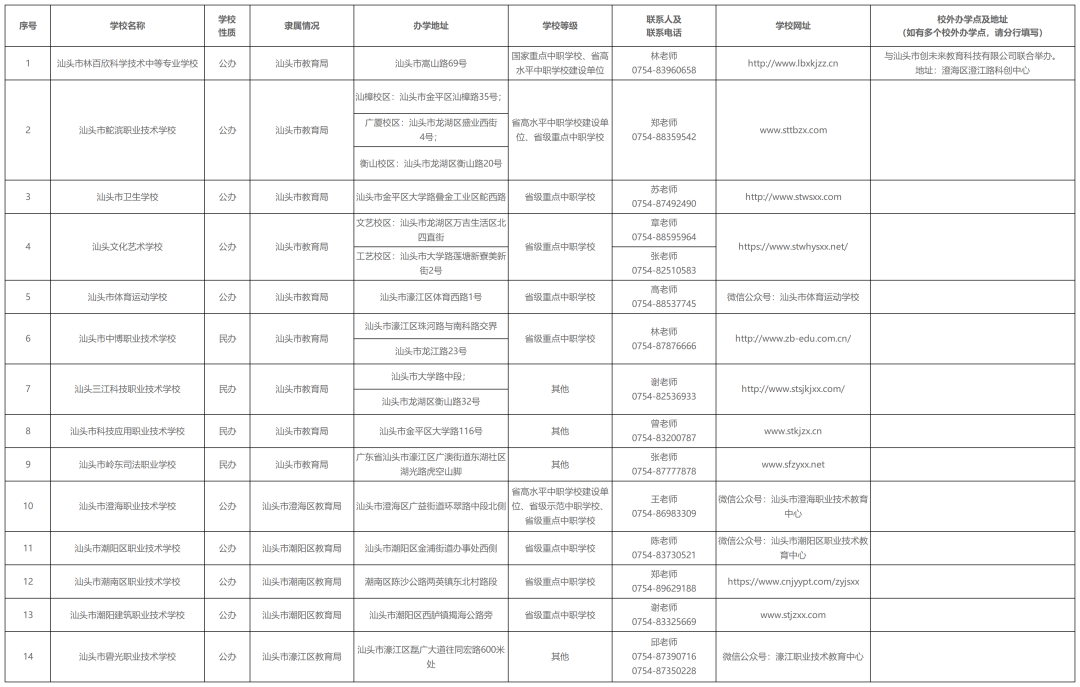 汕头市教育局2024年3月8日在网站上公布了《汕头市2024年中等职业教育拟招生学校名单》,汕头市内一共有14所中职学校具有招生资格!