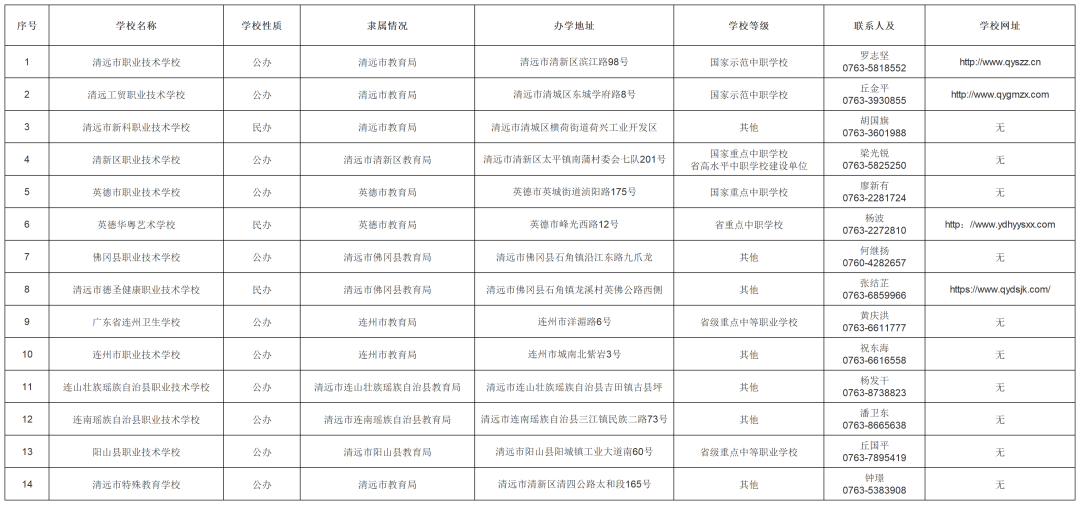 清远市教育局2024年3月8日在网站上公布了《2024年清远市中等职业教育拟招生学校名单汇总表》,清远市内一共有14所中职学校具备教育局认可的官方招生资格。
