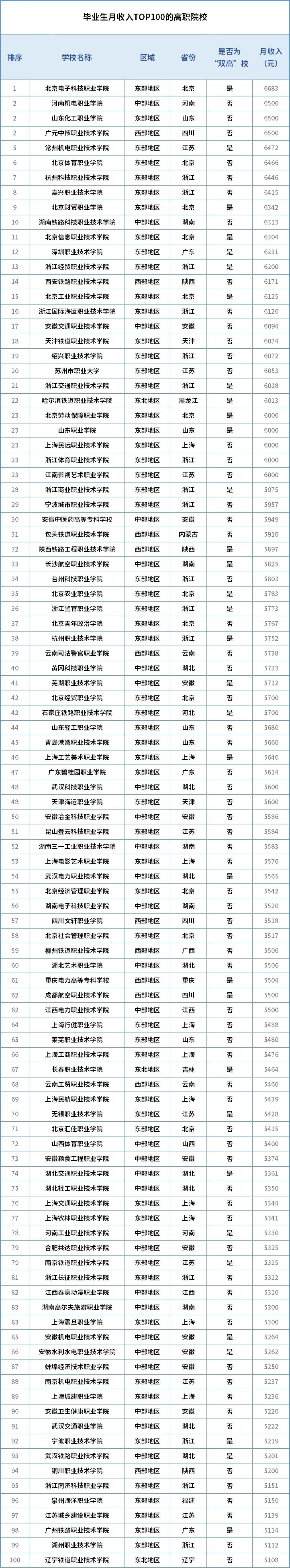 ◆ 具体到院校来看,Top100的高职毕业生月收入均超过了5000元,其中,北京电子科技职业学院毕业生月收入最高,达6683元,是全部院校中唯一超过6600元的。