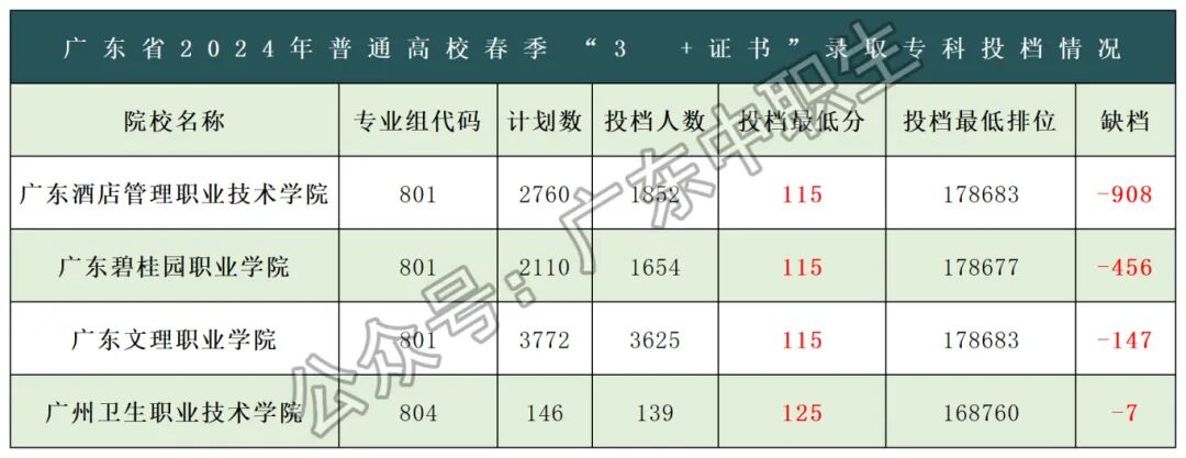 “3+证书”专科中职生批次绝大部分院校专业组已满档,仅4个院校专业组未满档。缺档人数为1518人,分别是广东文理职业学院缺档147、广东碧桂园职业学院缺档456、广东酒店管理职业技术学院908、广州卫生职业技术学院7。