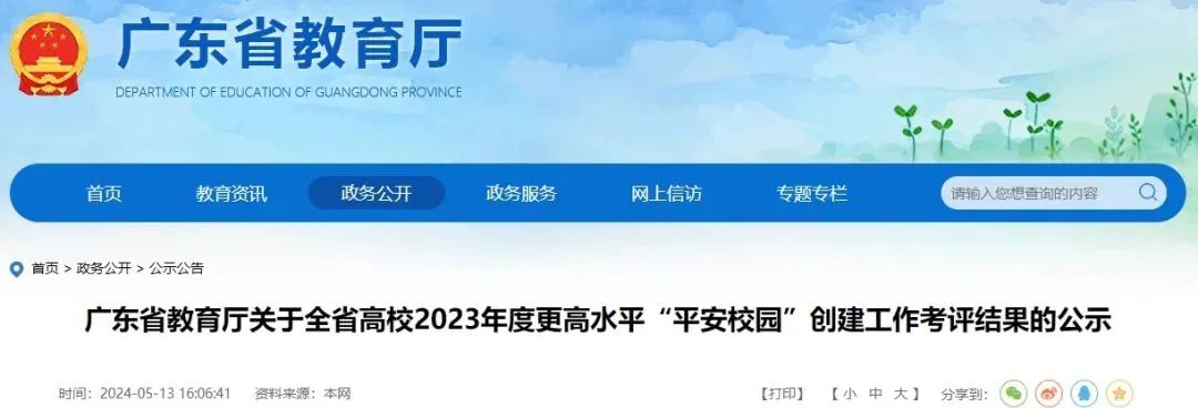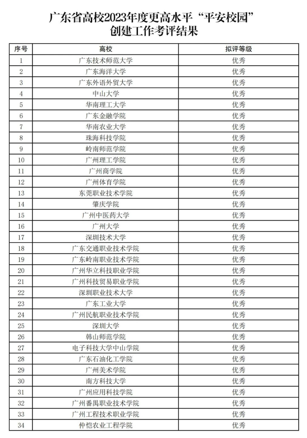 近日,广东省教育厅公示全省高校2023年度更高水平“平安校园”创建工作考评结果。