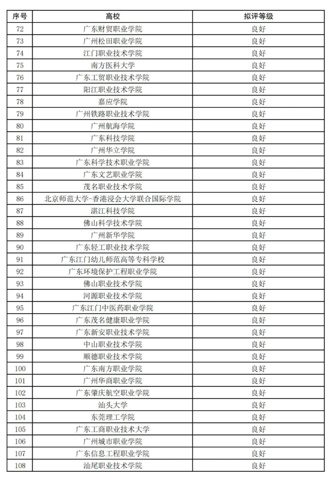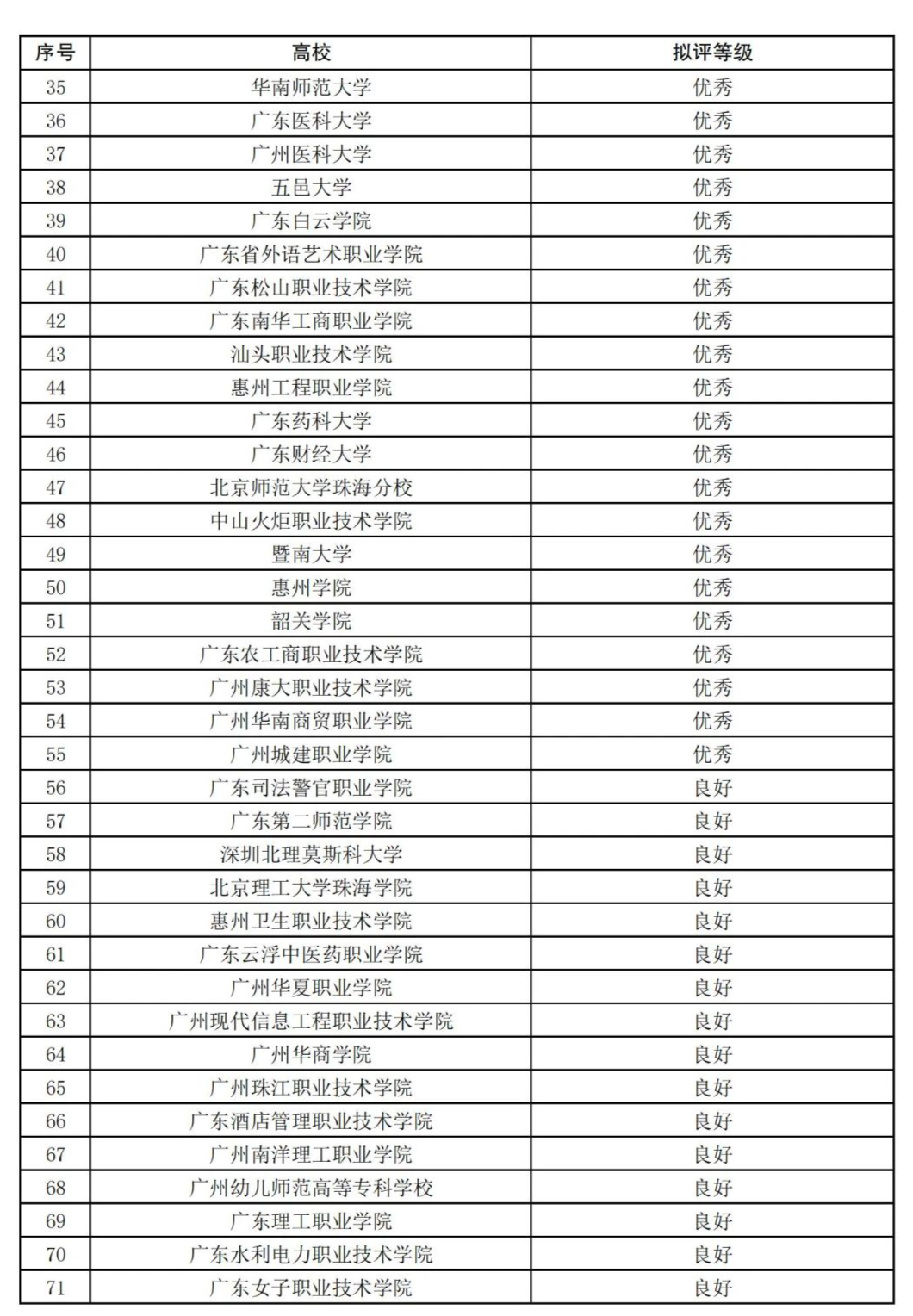 结果显示:在全部160所参评高校中,中山大学、华南农业大学、广东技术师范大学等55校拟获评“优秀”;南方医科大学、广东第二师范学院、嘉应学院等55校拟获评“良好”;香港中文大学(深圳)、广东警官学院、深圳信息职业技术学院等47校拟获评“及格”。