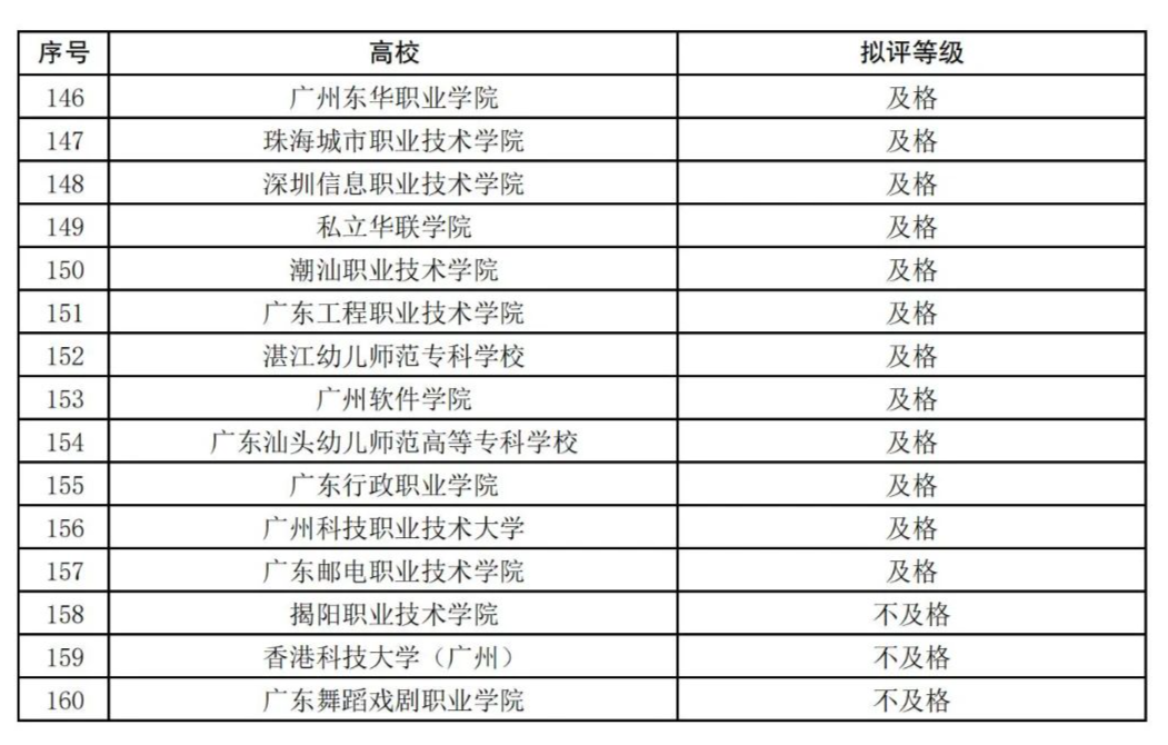 3所高校拟评等级为“不及格”,分别是:香港科技大学(广州)、揭阳职业技术学院、广东舞蹈戏剧职业学院。
