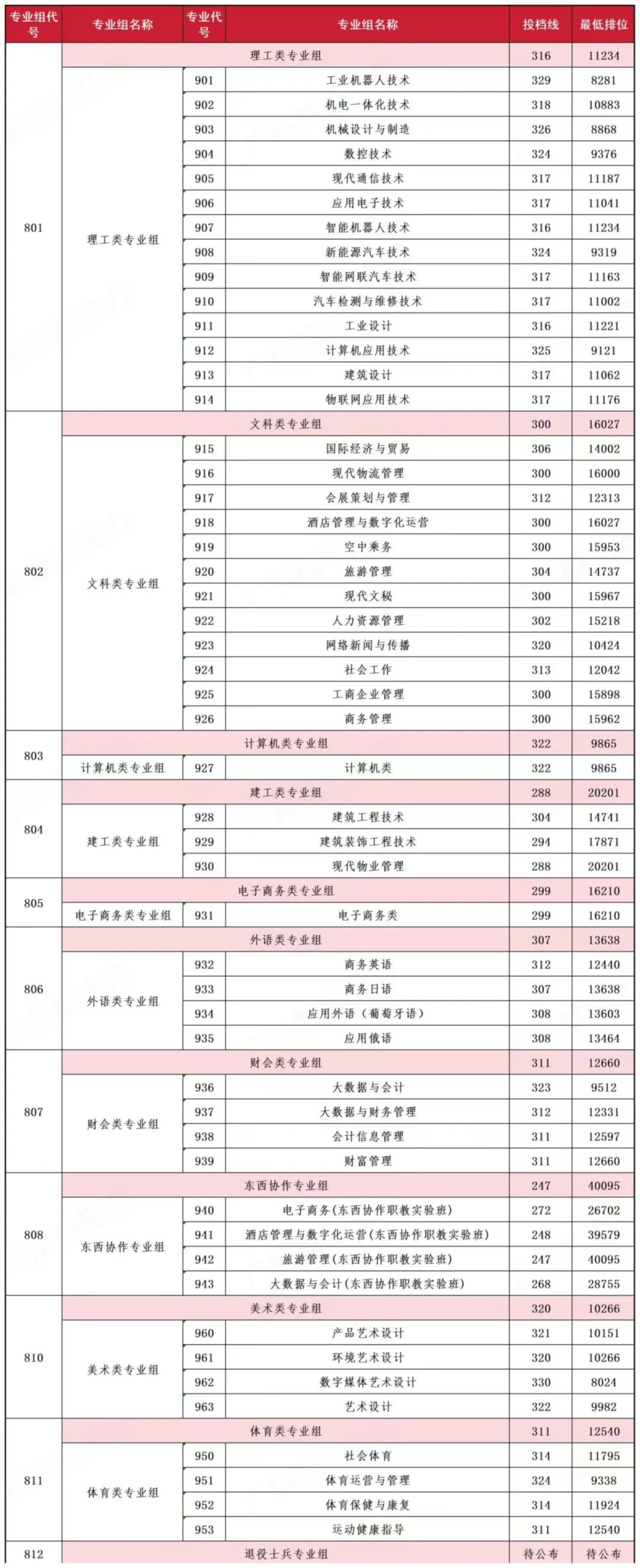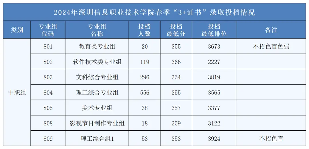 深信职投档分最高的802专业组,投档最低分366分,排位2227名,对比2023年同专业组,投档最低分上涨30+分,排位提升900+名!深信院的投档热度一直在增加,是不少高分考生的不二之选。