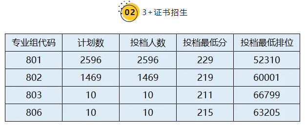 今年3+证书一次满档,最低投档分228分,最低排位53510!