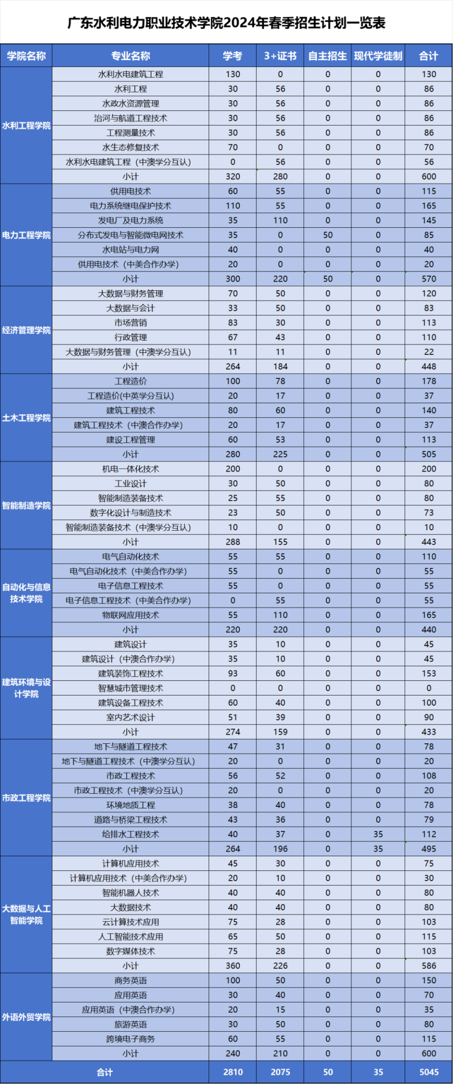 广东水利电力职业技术学院2024年3+证书计划招生2075人。