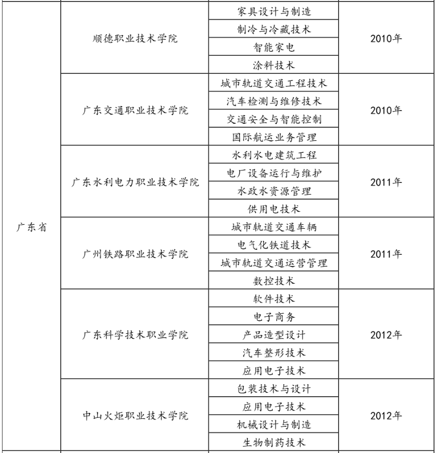 广东地区共有7所院校入选“国家骨干高职院校名单”,分别是:广东科学技术职业学院、深圳信息职业技术学院、顺德职业技术学院、广东交通职业技术学院、广东水利电力职业技术学院、广州铁路职业技术学院、中山火炬职业技术学院。