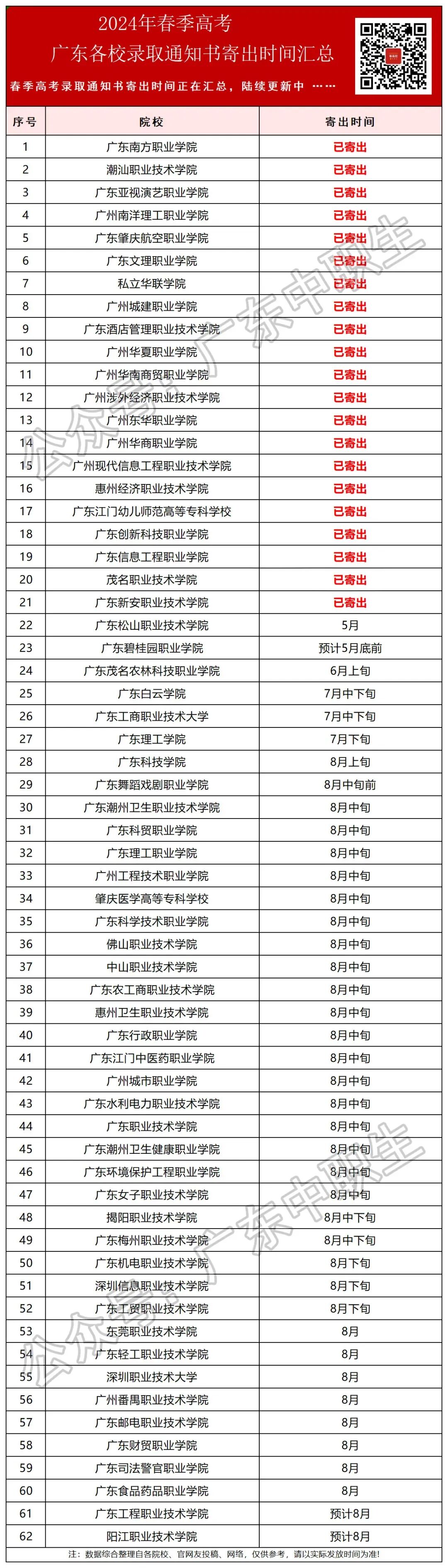 广东春季高考(3+证书/学考)的录取通知书邮寄时间视院校安排而定,部分院校在录取结束后(5月份左右)寄出,10天内可到;部分院校在秋季高考结束后和普通高中生一起邮寄(一般为8月份),具体通知书发放时间可向录取学校电话或QQ群咨询。