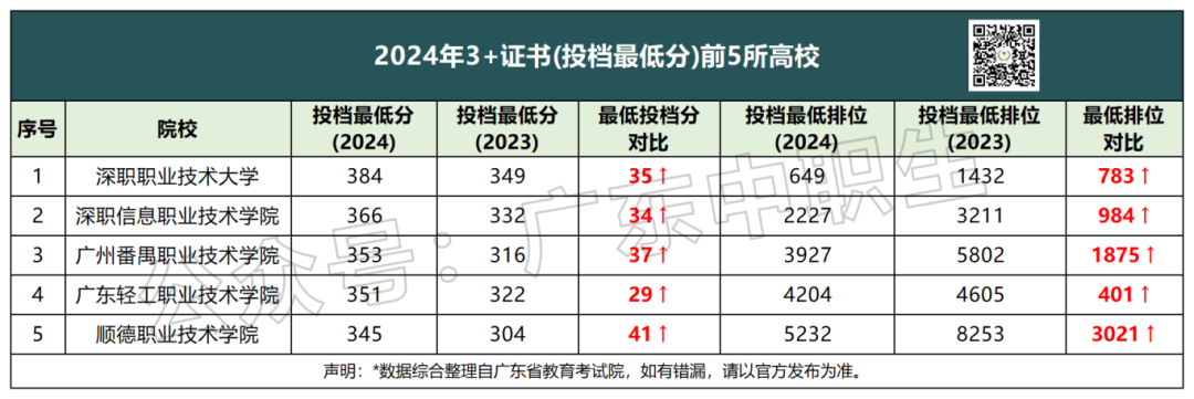 据统计,2024年3+证书(投档最低分)中最高的五所高校分别是深圳职业技术大学、深圳信息职业技术学院、广州番禺职业技术学院、广东轻工职业技术学院、顺德职业技术学院。