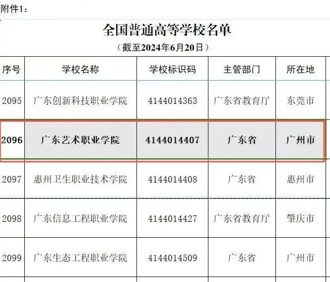 教育部官方网站2024年6月21日发布最新《全国高等学校名单》,名单中收录广东艺术职业学院(学校标识码:4144014407)。