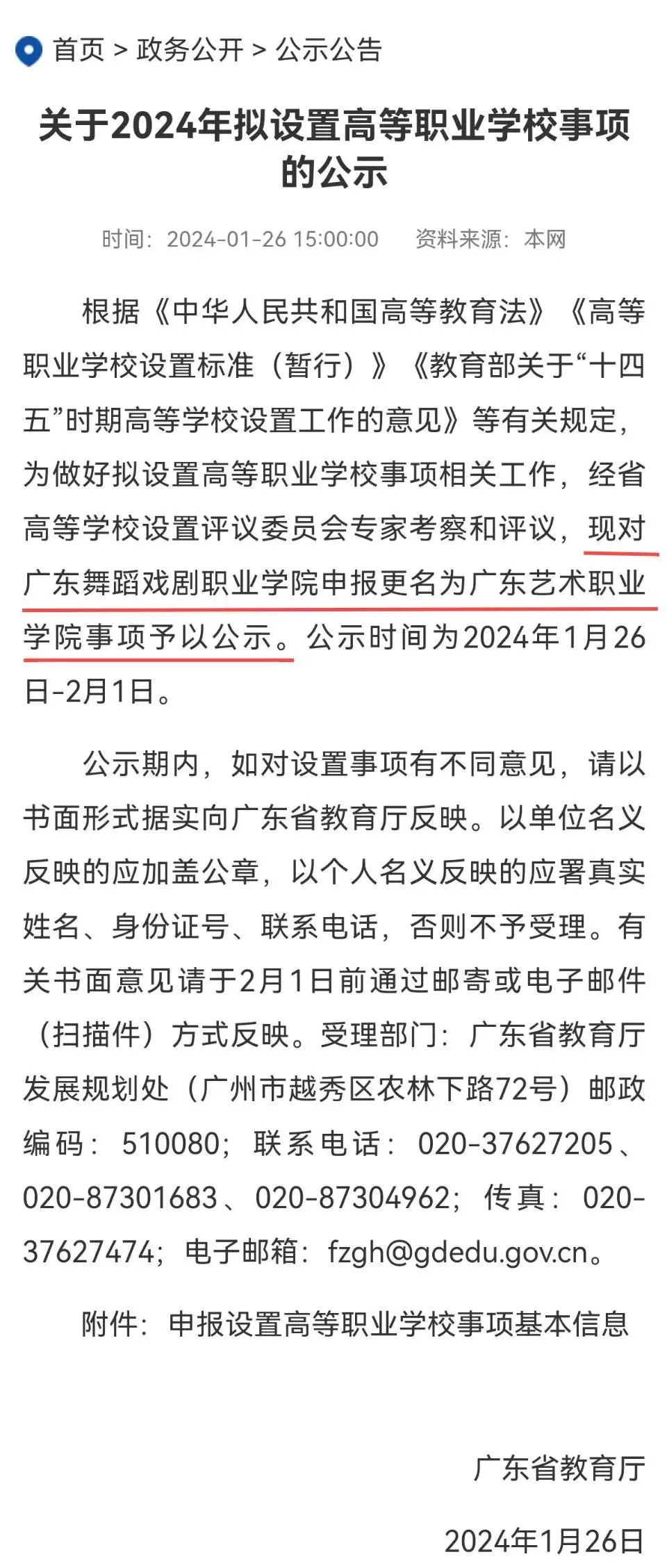 6月22日,广东舞蹈戏剧职业学院官微发布公告明确:广东舞蹈戏剧职业学院正式更名为“广东艺术职业学院”。