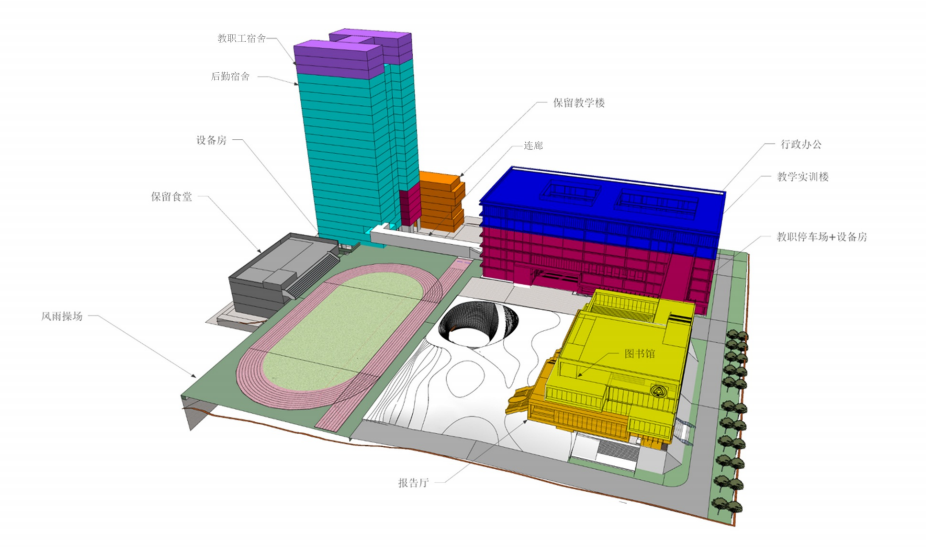 新建实训综合楼,图书馆综合楼,室内体育馆及宿舍综合楼各1栋,新建总建筑面积73667.99平方米。项目建成后可提供2044张学生床位,配套教学楼、实验室、图书馆、田径场、体育馆、食堂等。