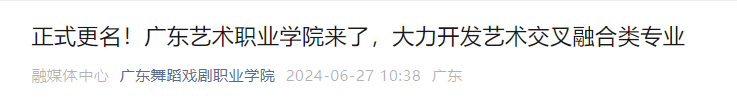近日,教育部办公厅公布2024年度第三批实施专科教育高等学校备案名单,将省级人民政府审批设置的专科层次高等学校备案名单予以公布。其中,广东舞蹈戏剧职业学院正式更名为广东艺术职业学院。