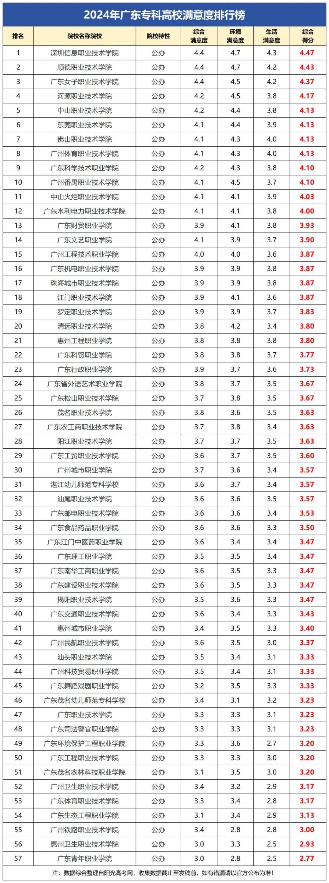 根据阳光高考网,整理2024年广东省专科院校满意度排行榜(数据截止至:2024年6月24日),供参考!