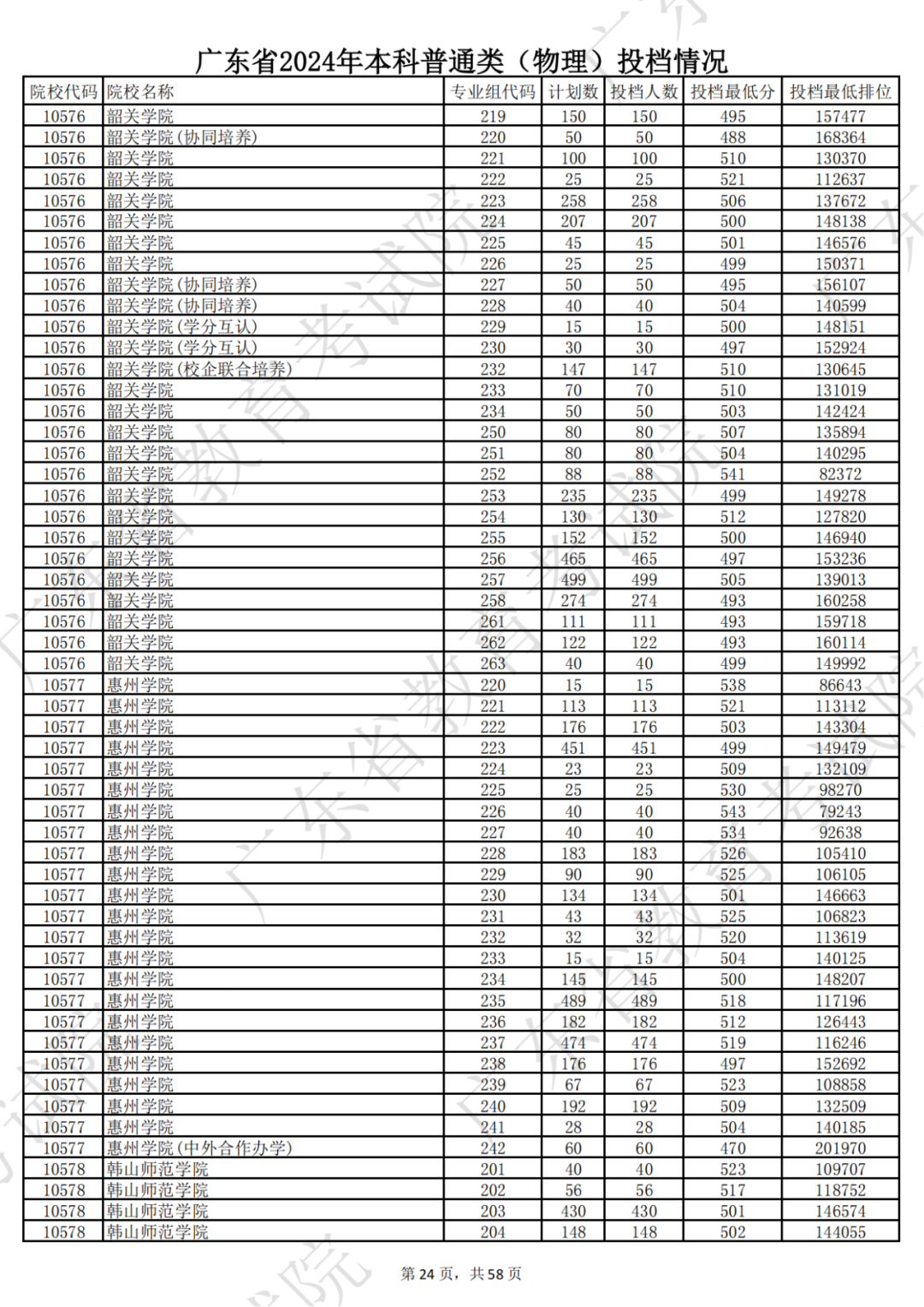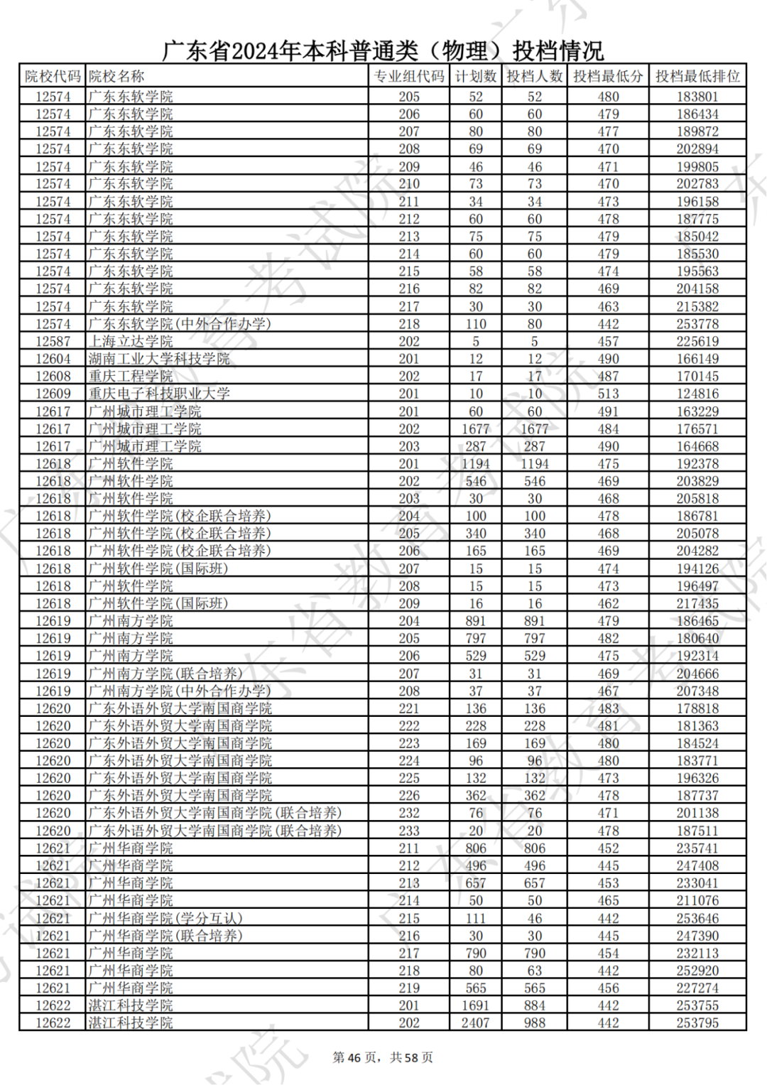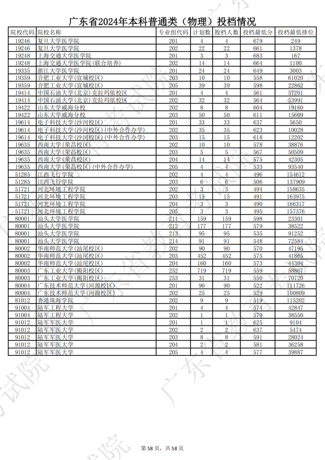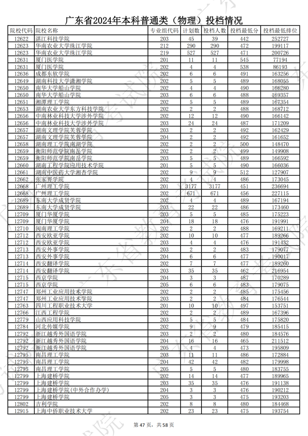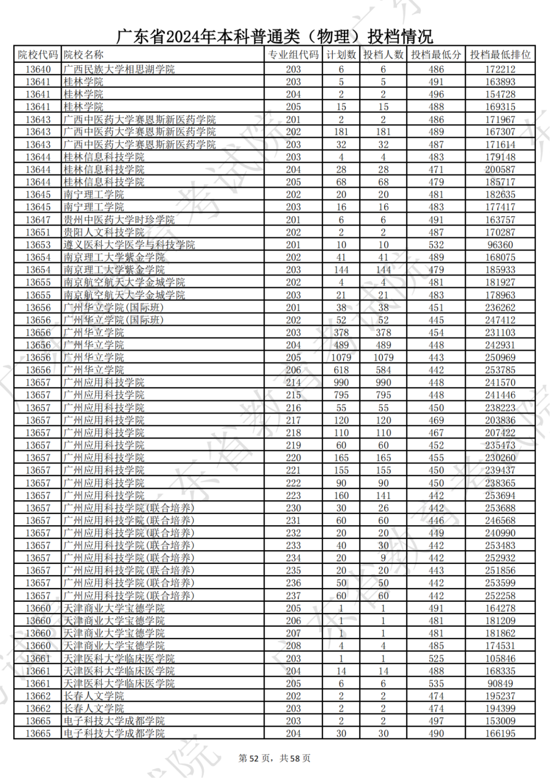 广东省2024年本科物理类投档情况