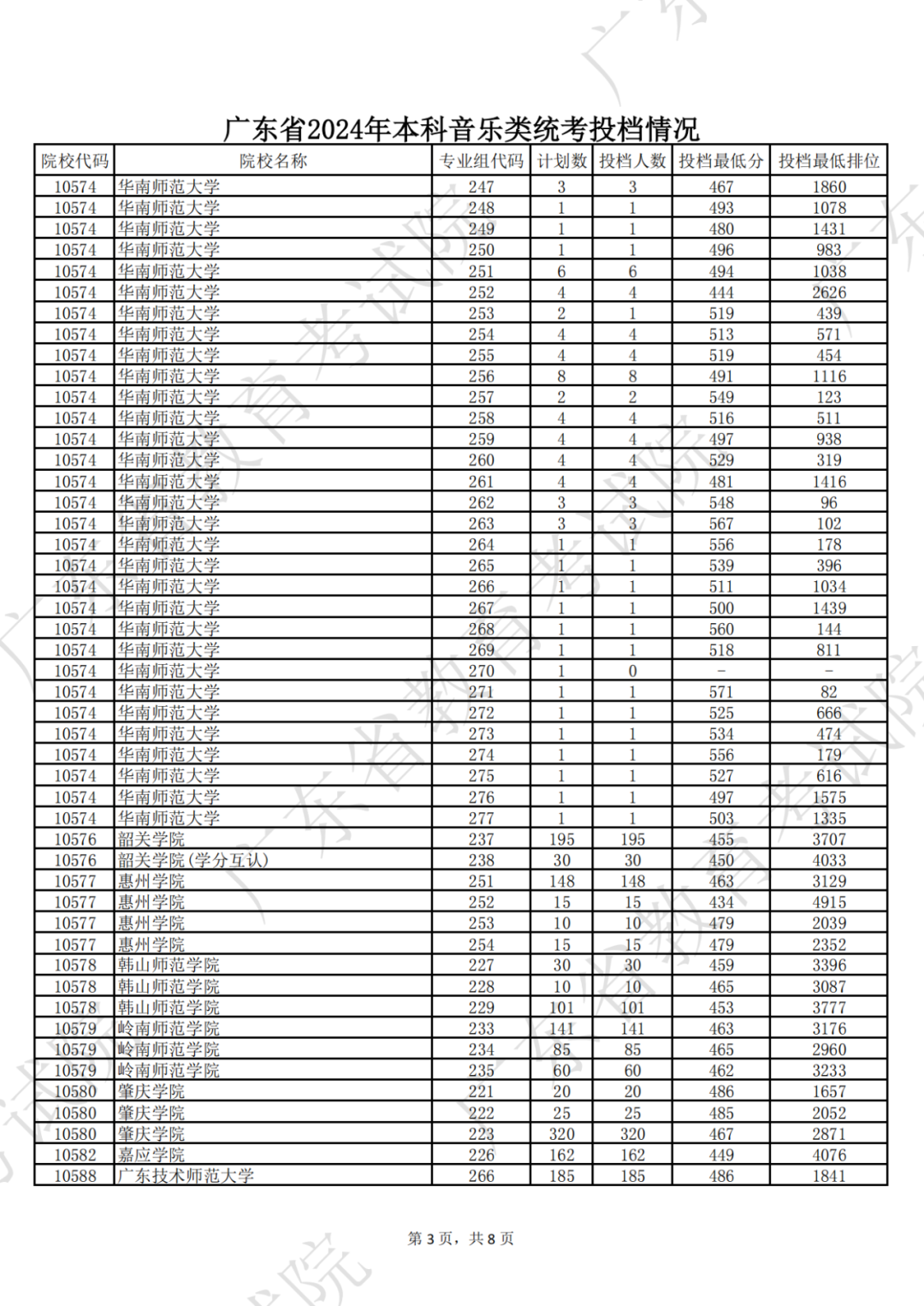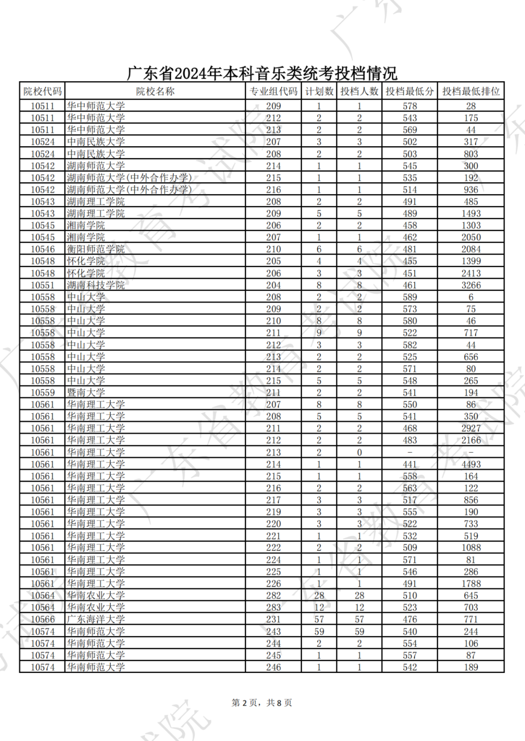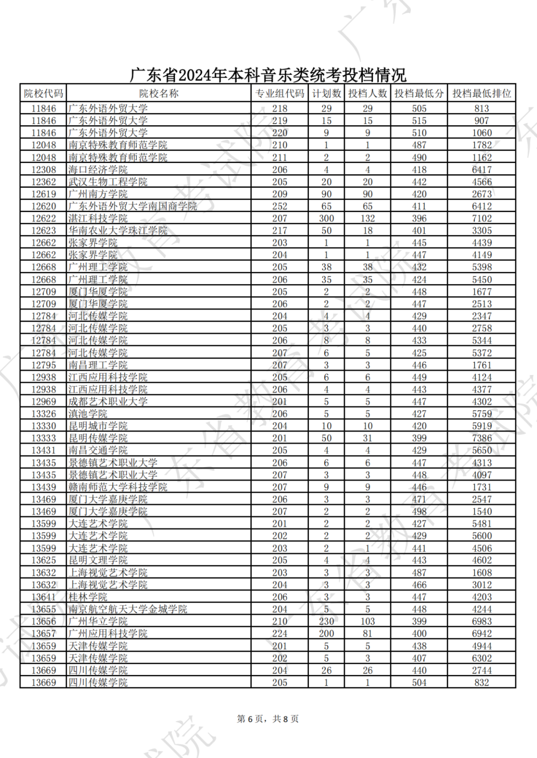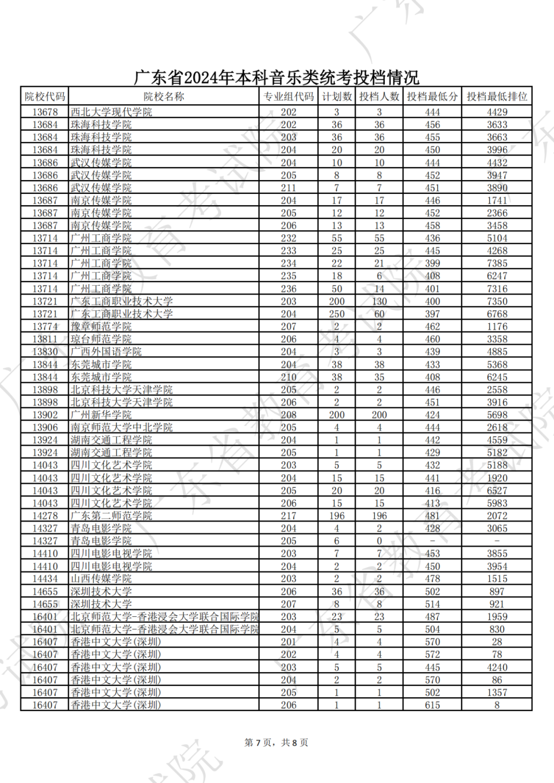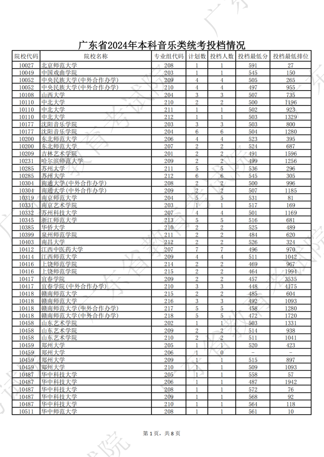 广东省2024年本科音乐类统考投档情况