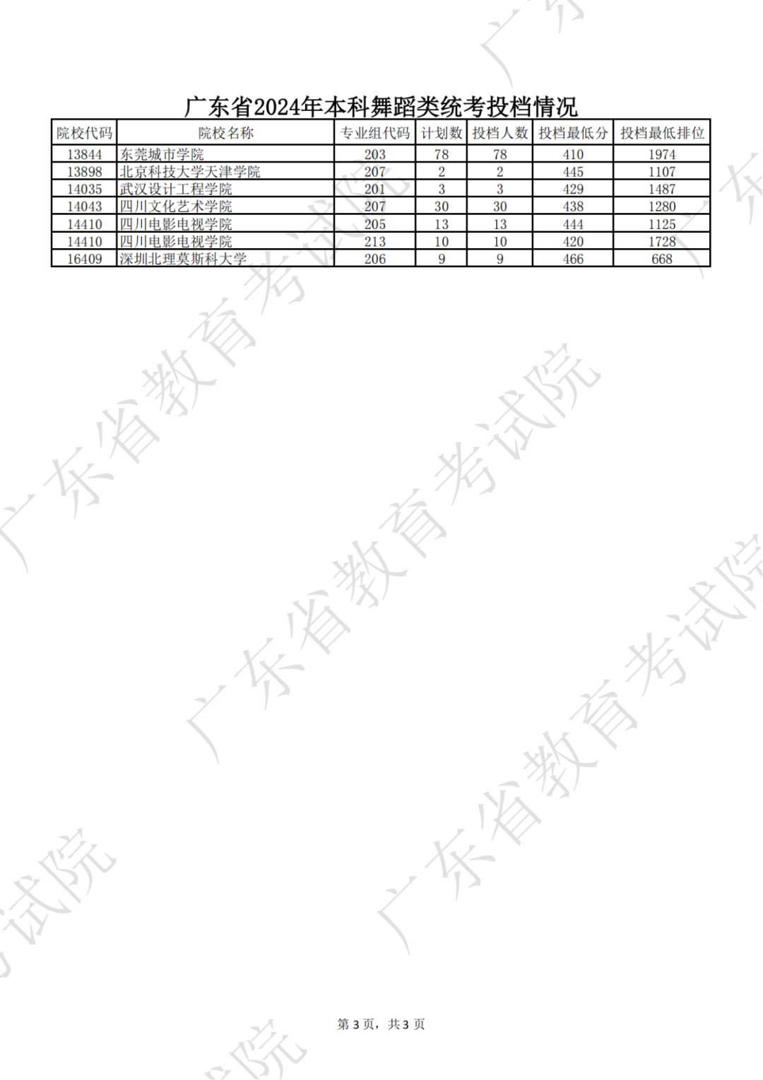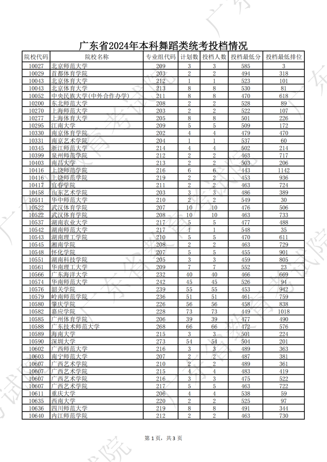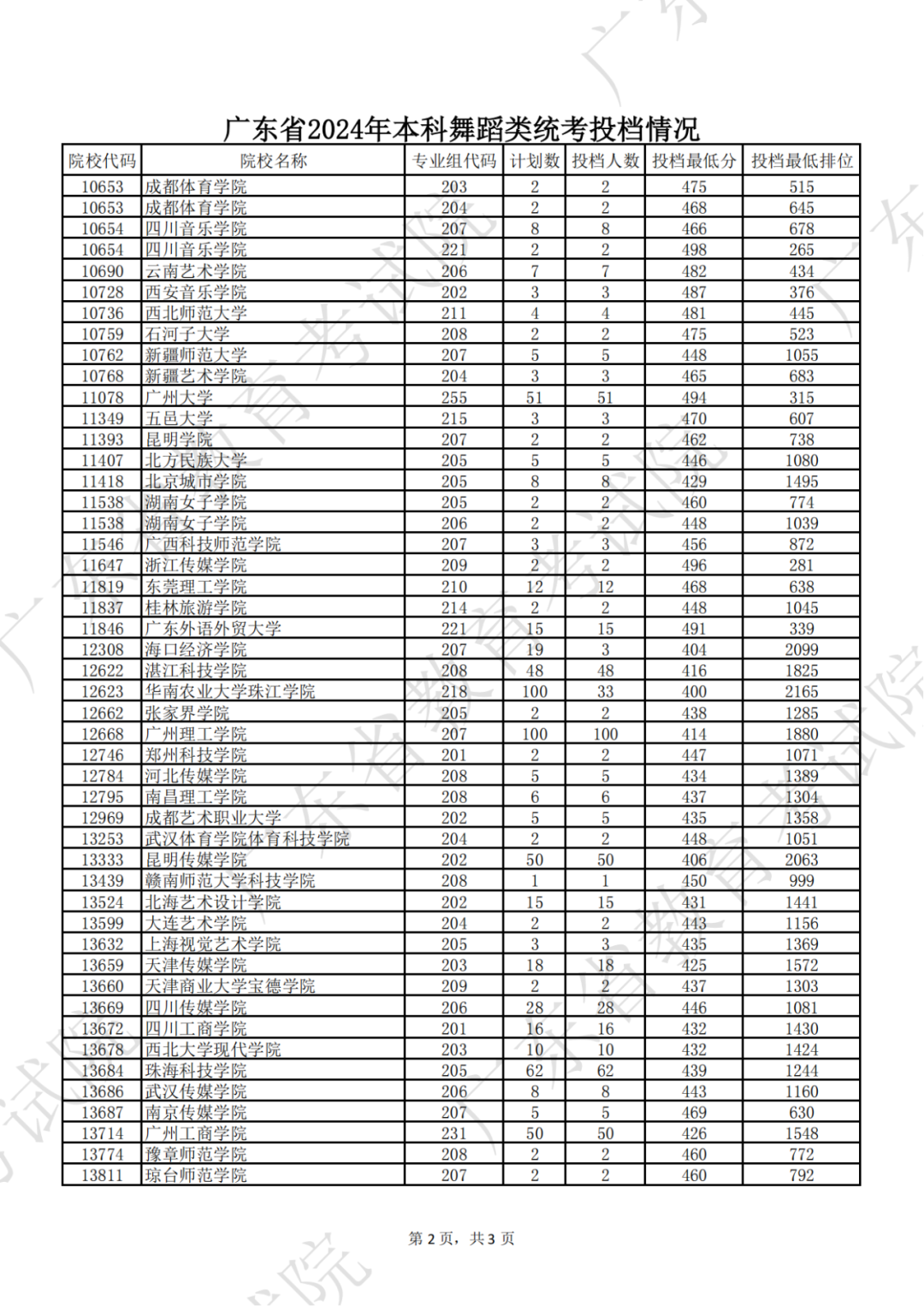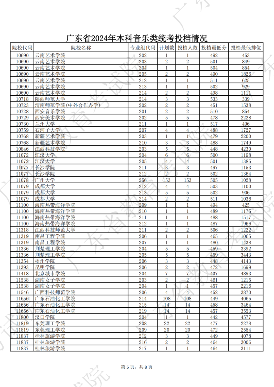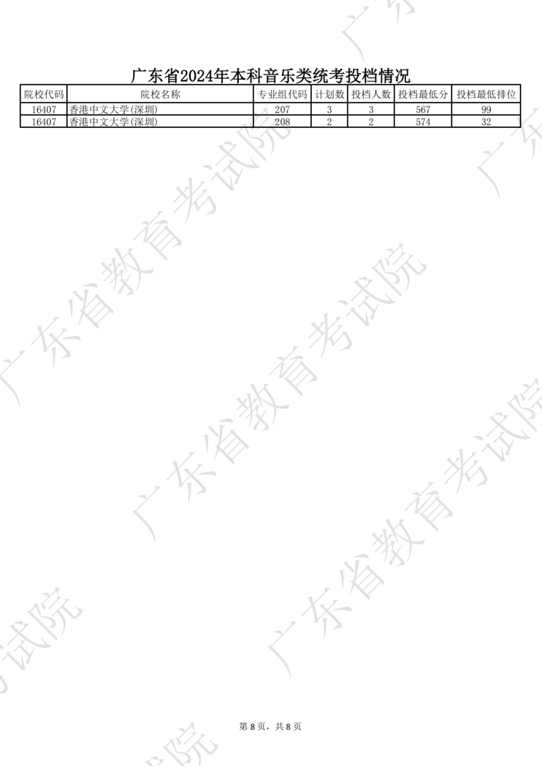 广东省2024年本科音乐类统考投档情况