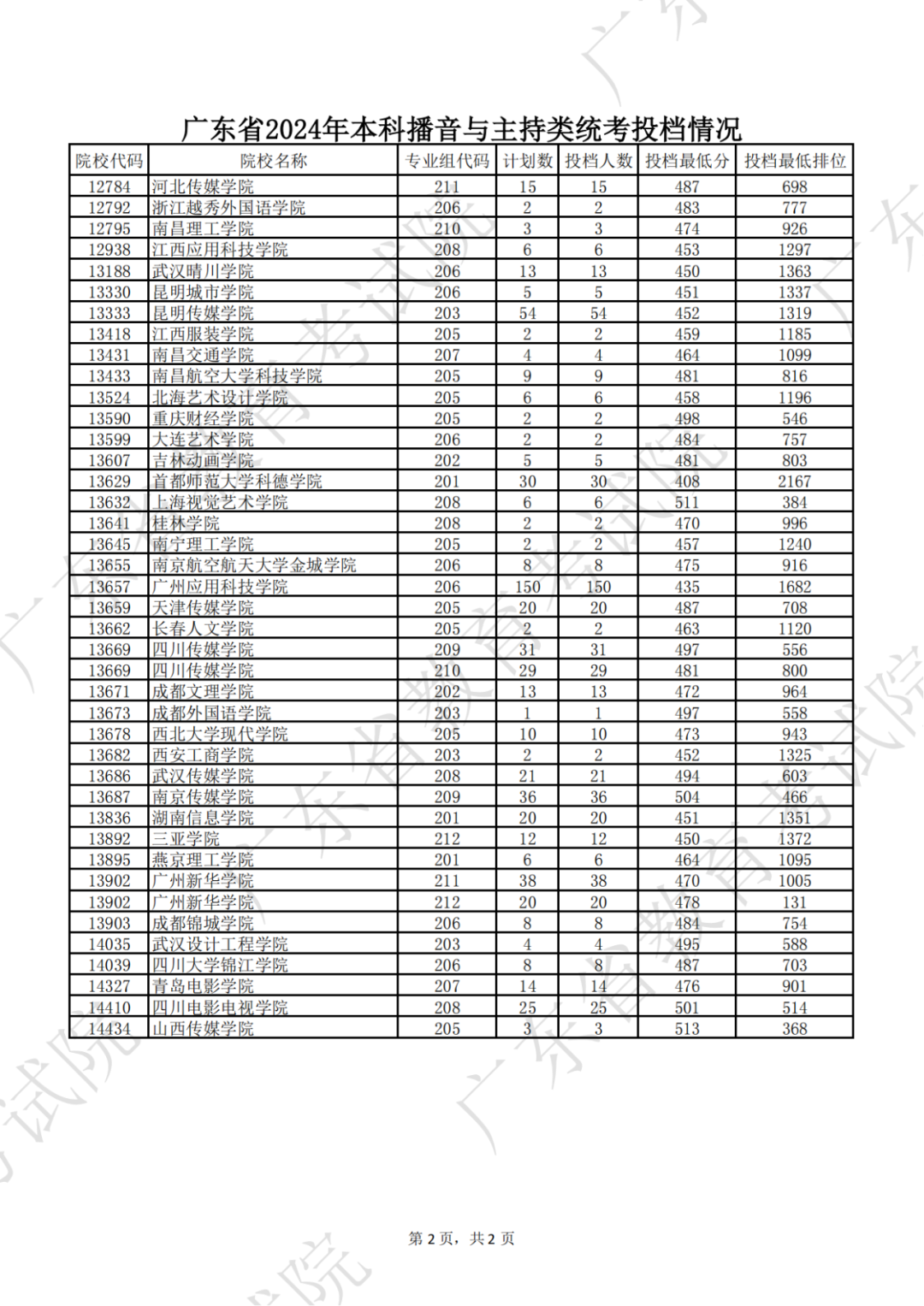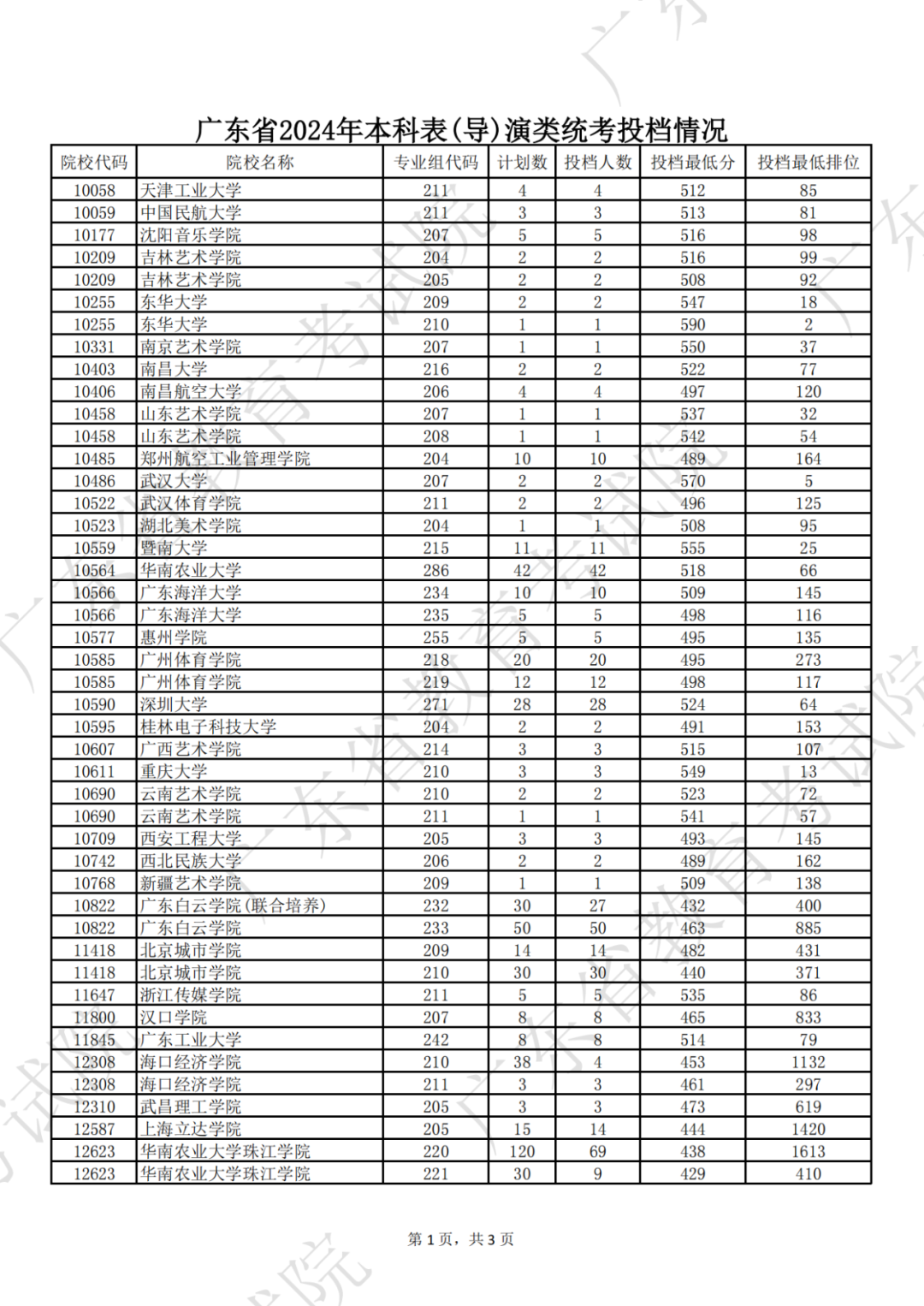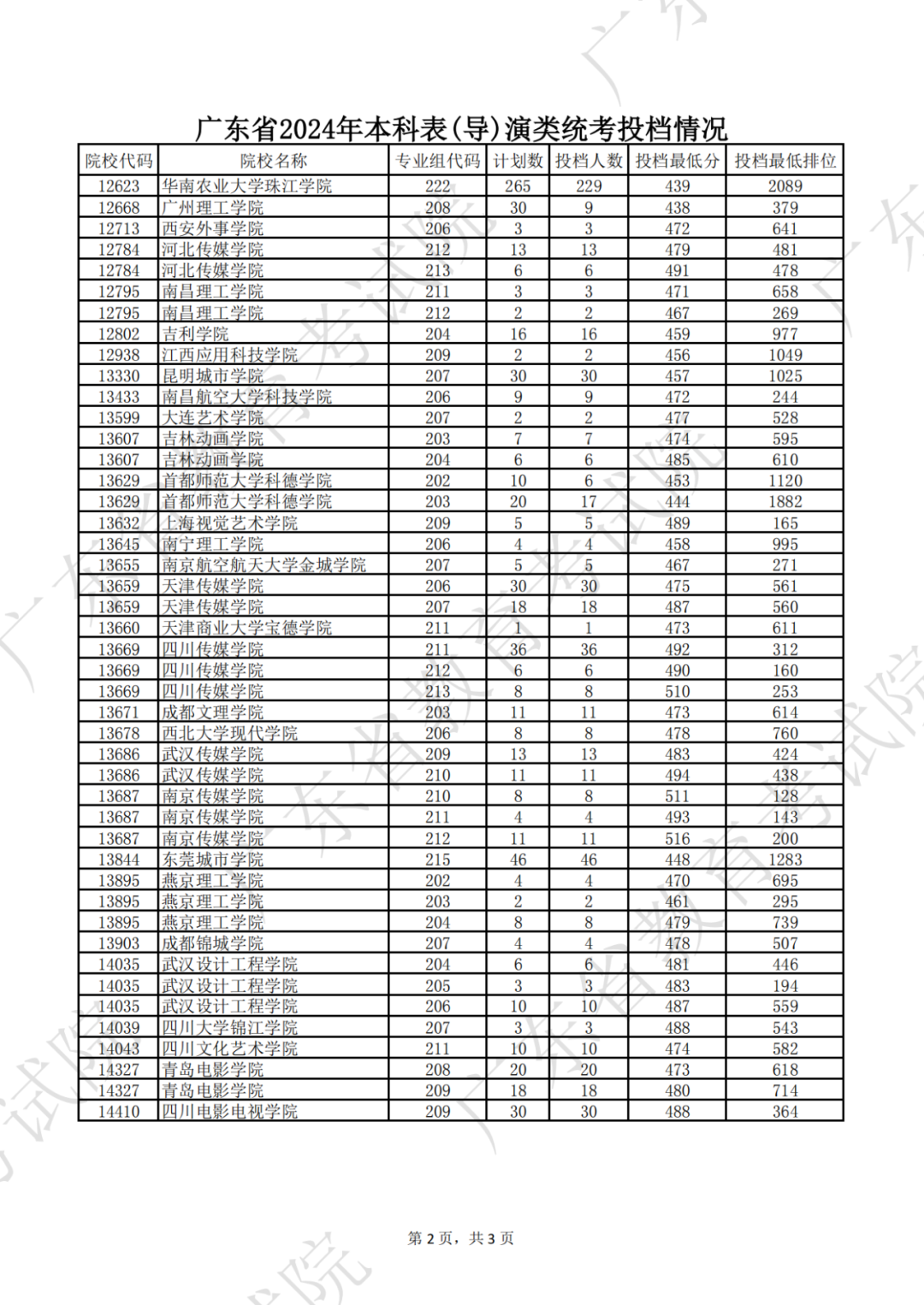 广东省2024年本科表(导)演类统考投档情况