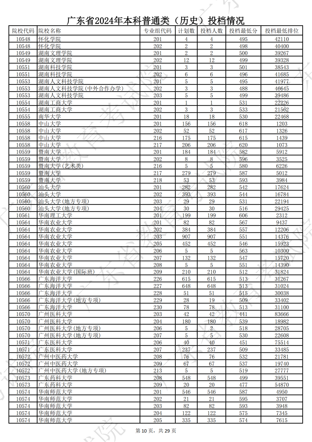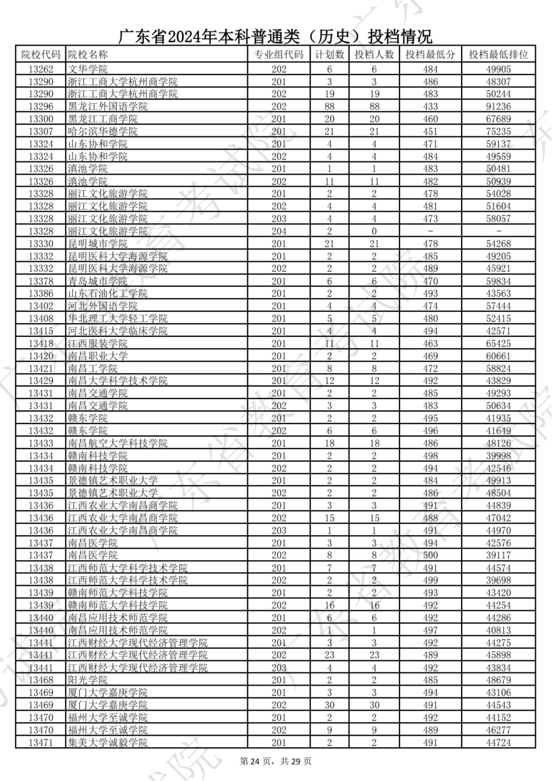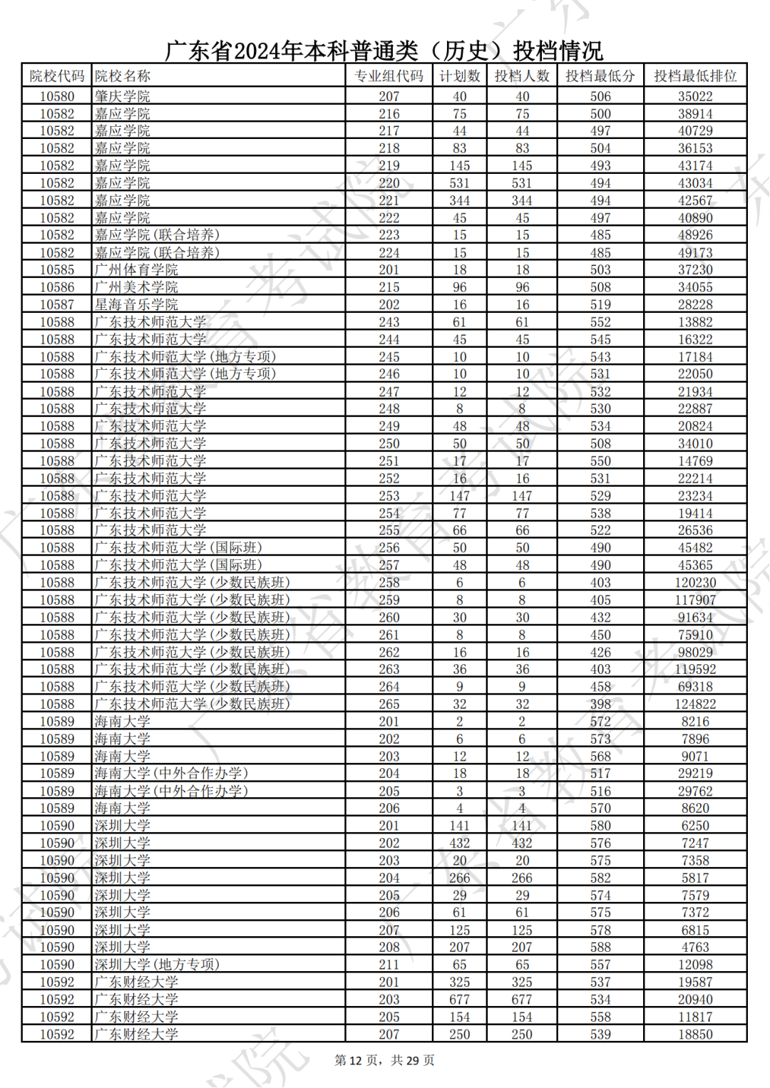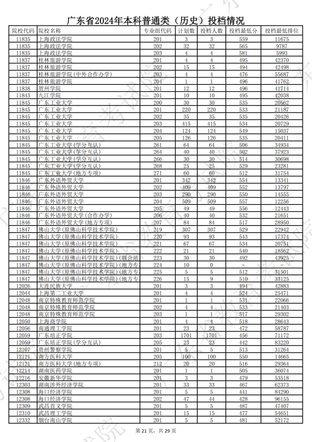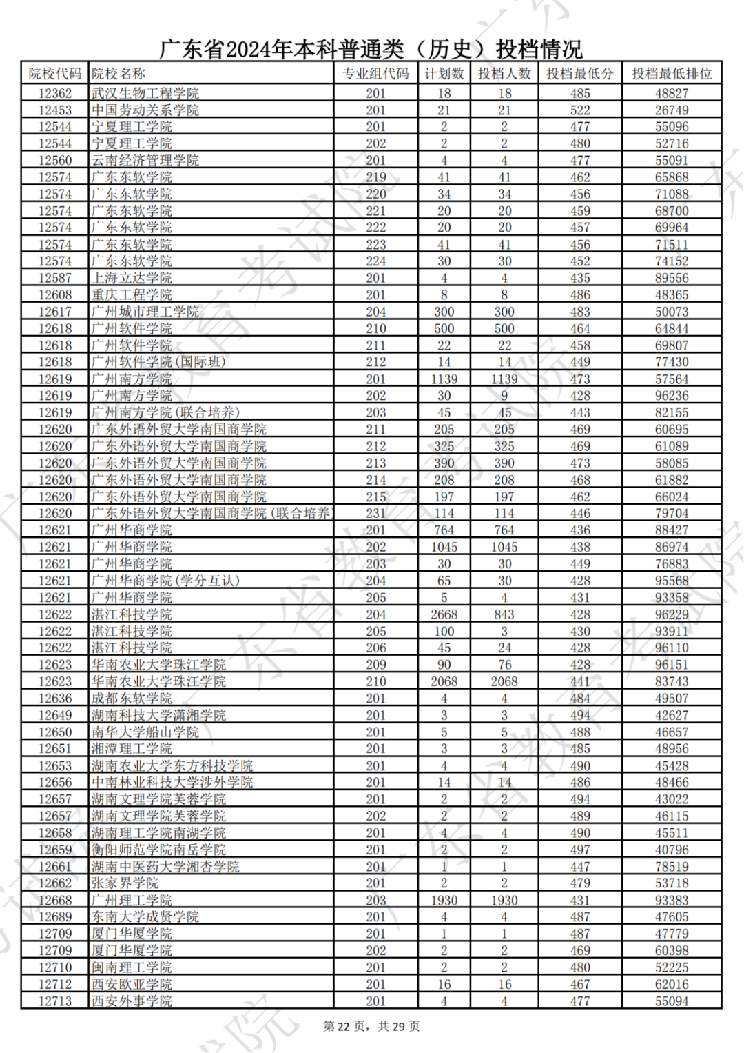 广东省2024年本科历史类投档情况