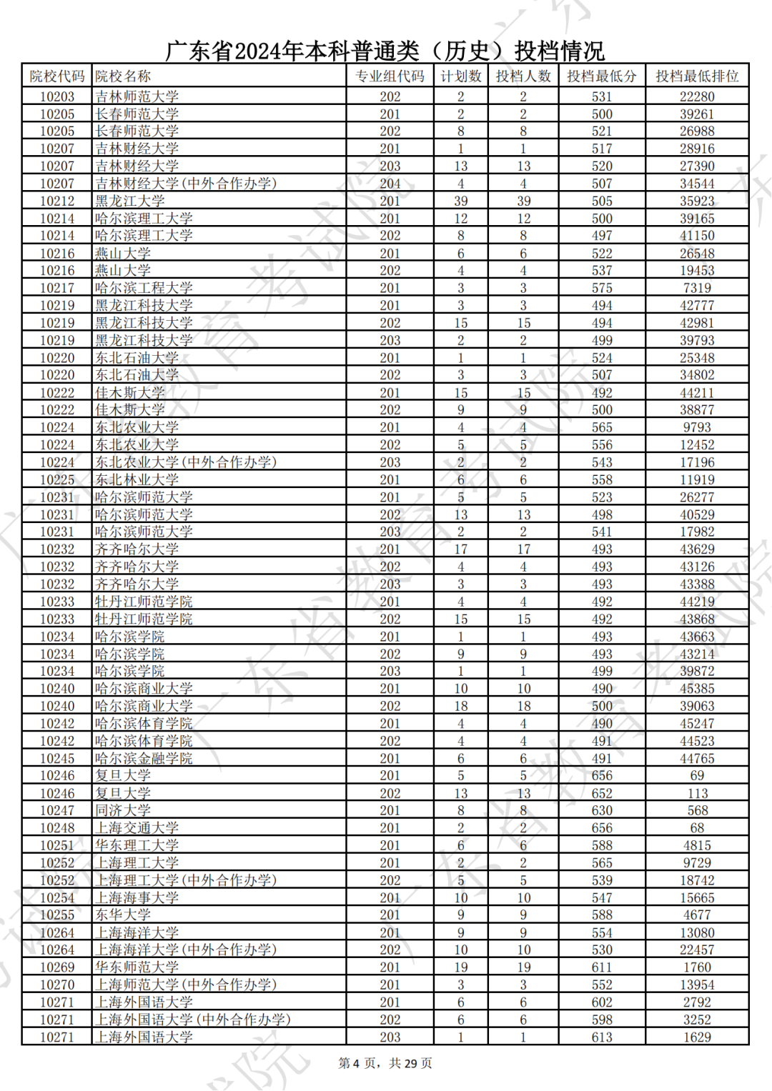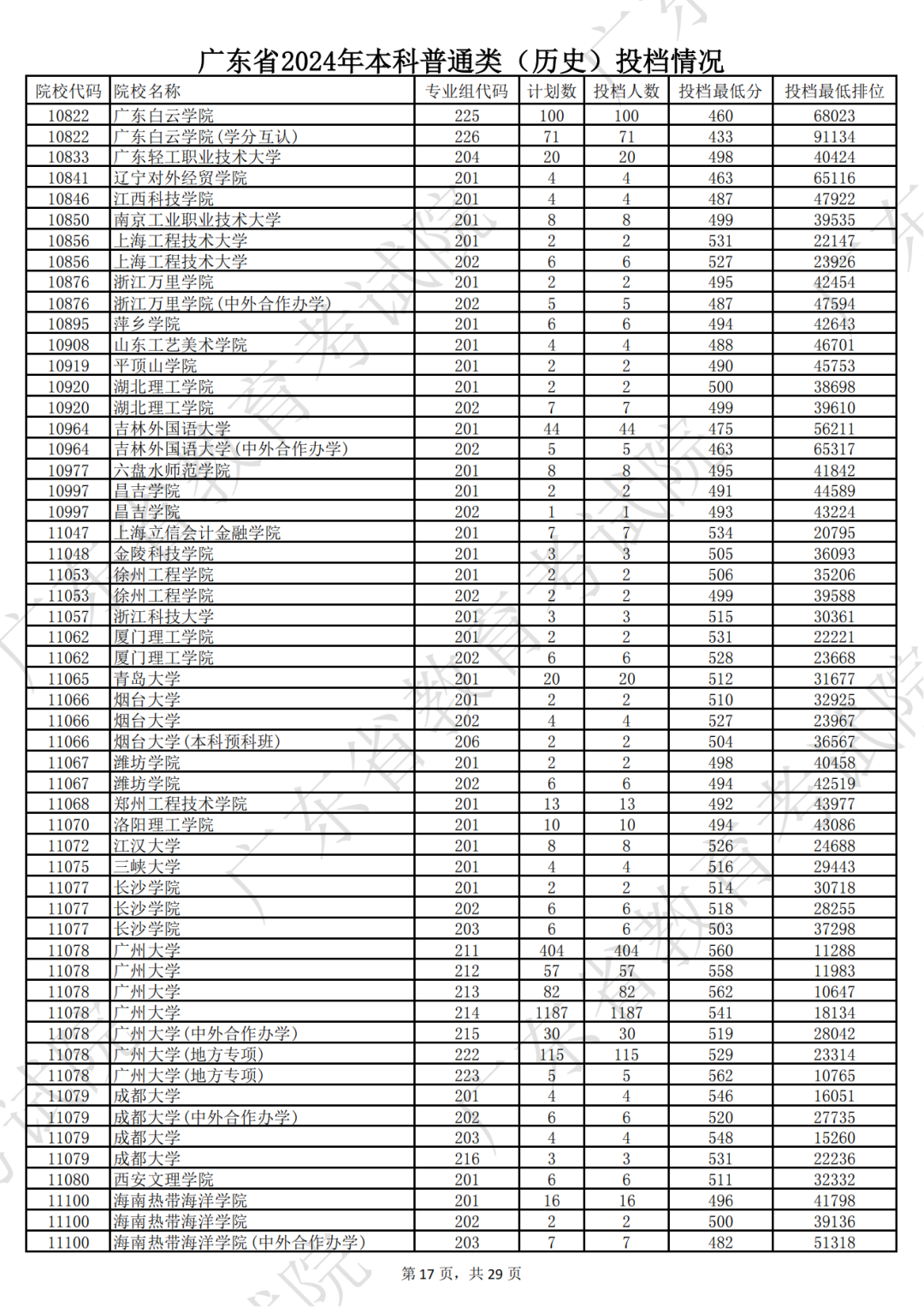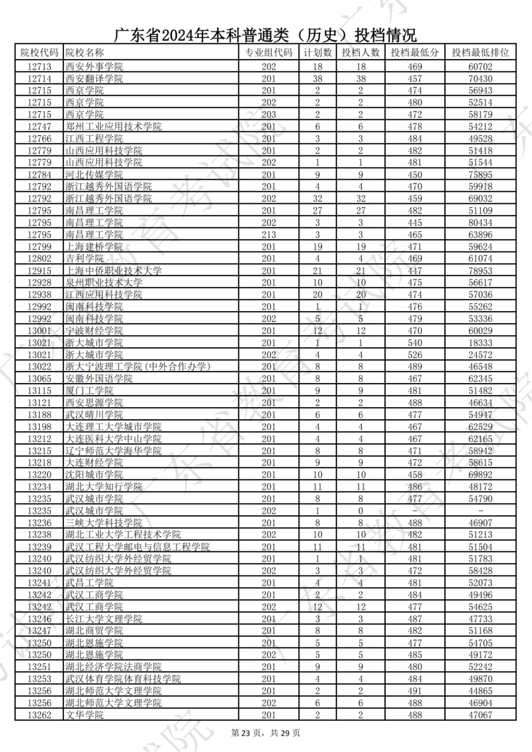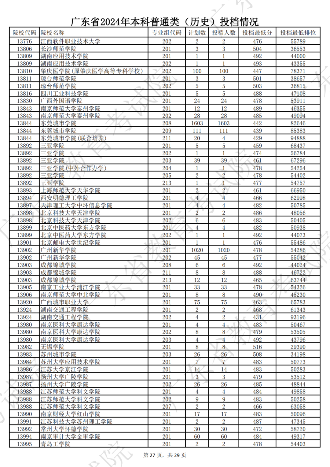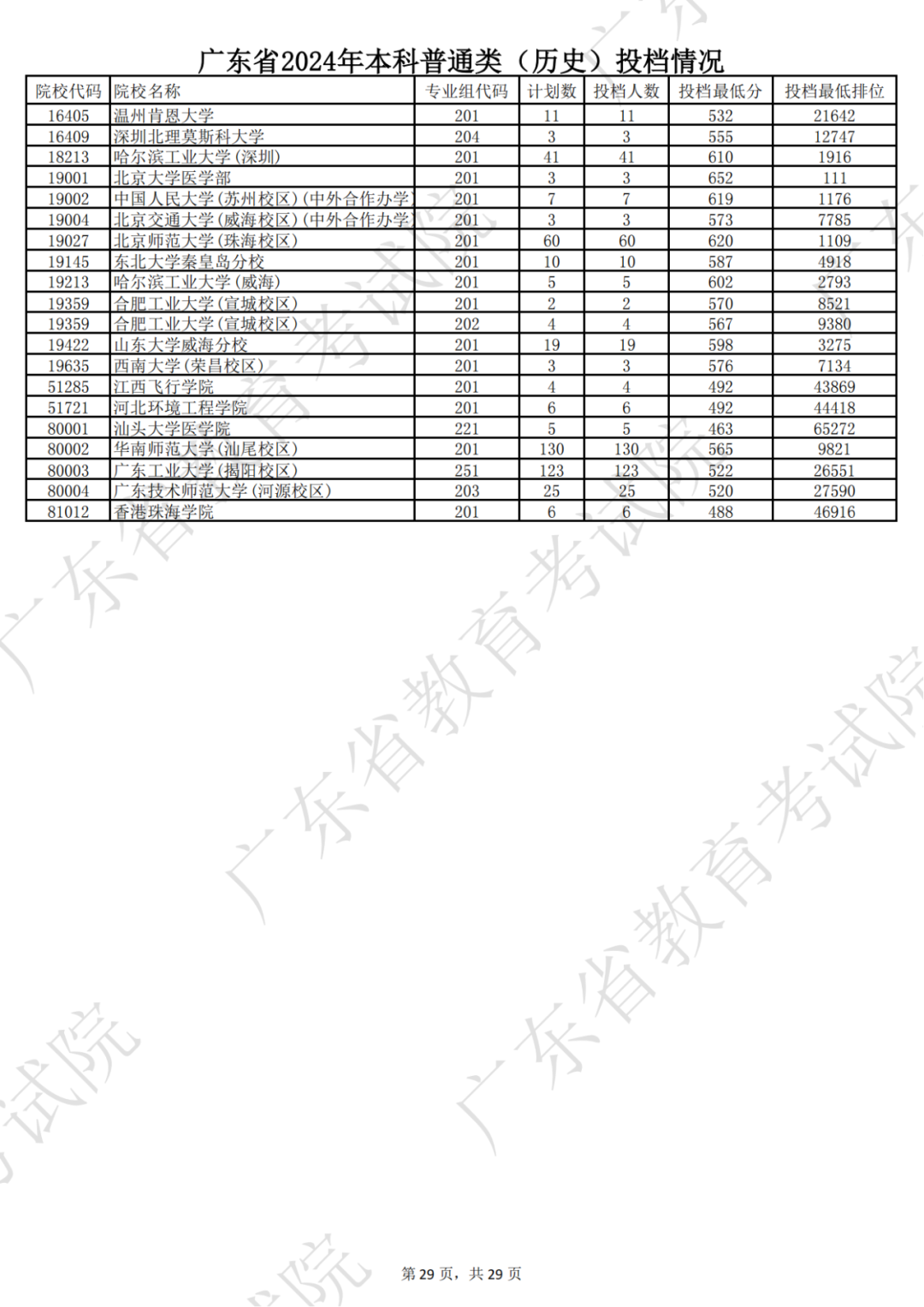 广东省2024年本科历史类投档情况