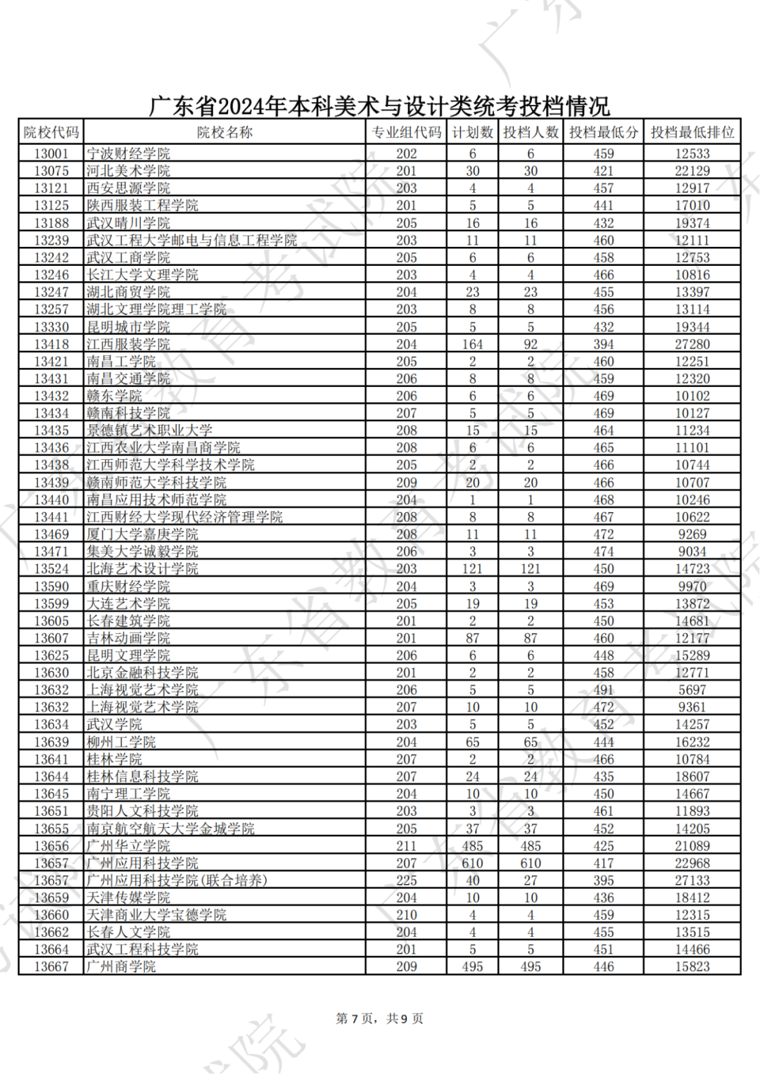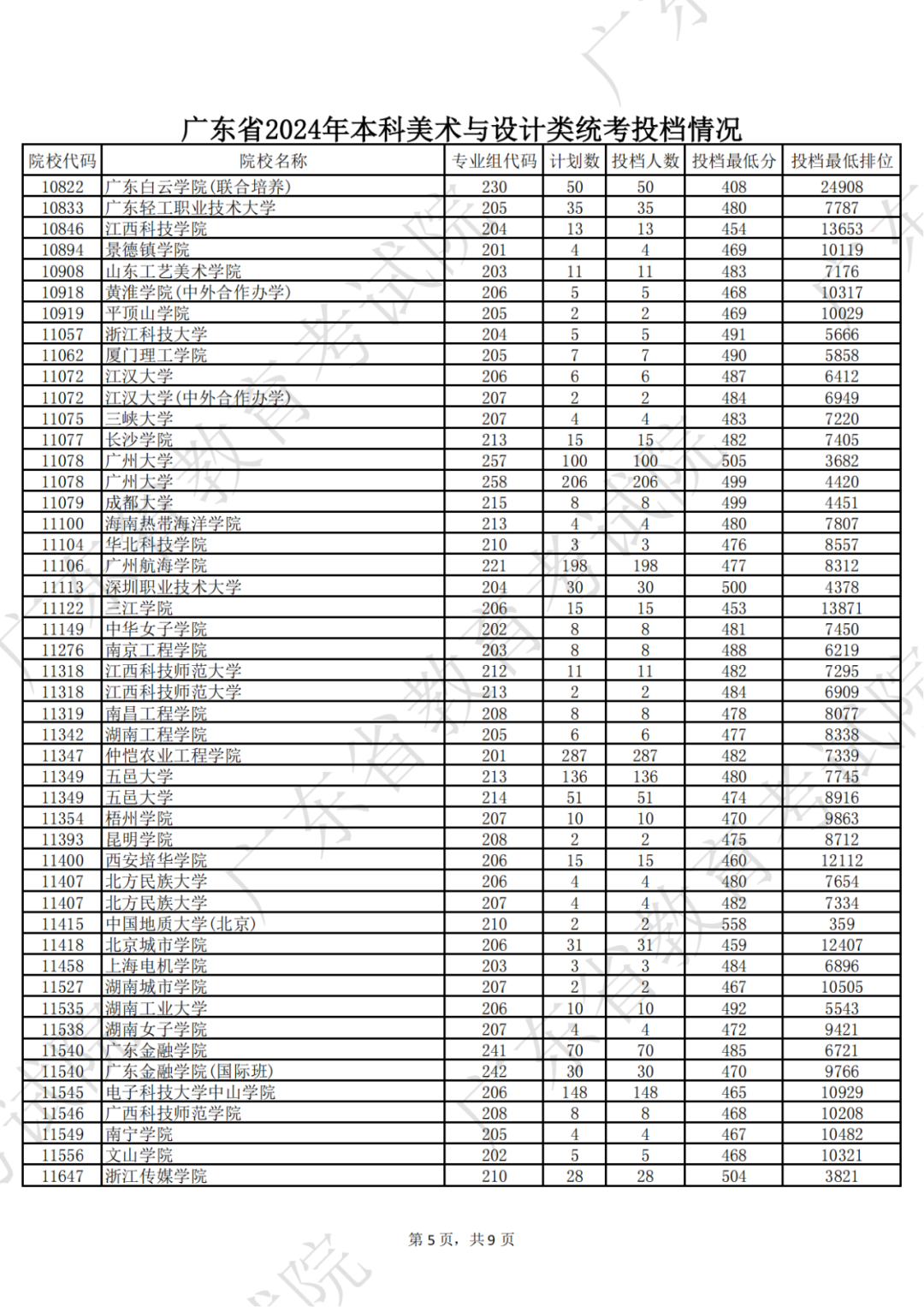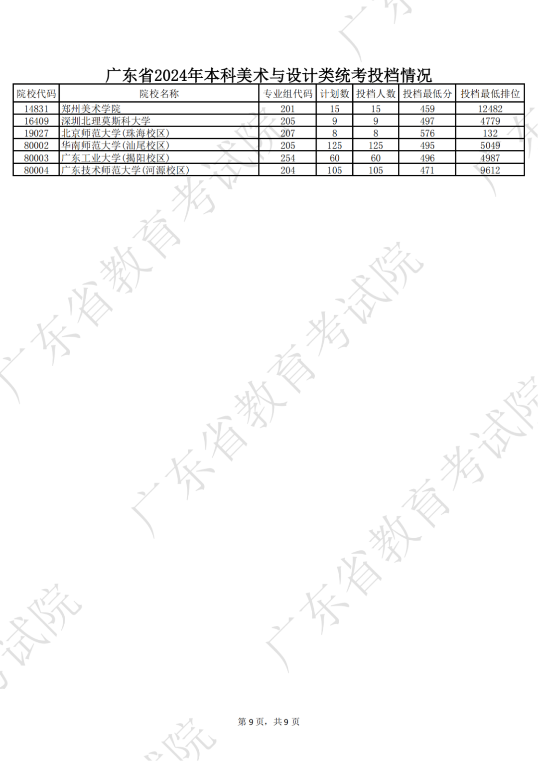 广东省2024年本科美术与设计类统考投档情况