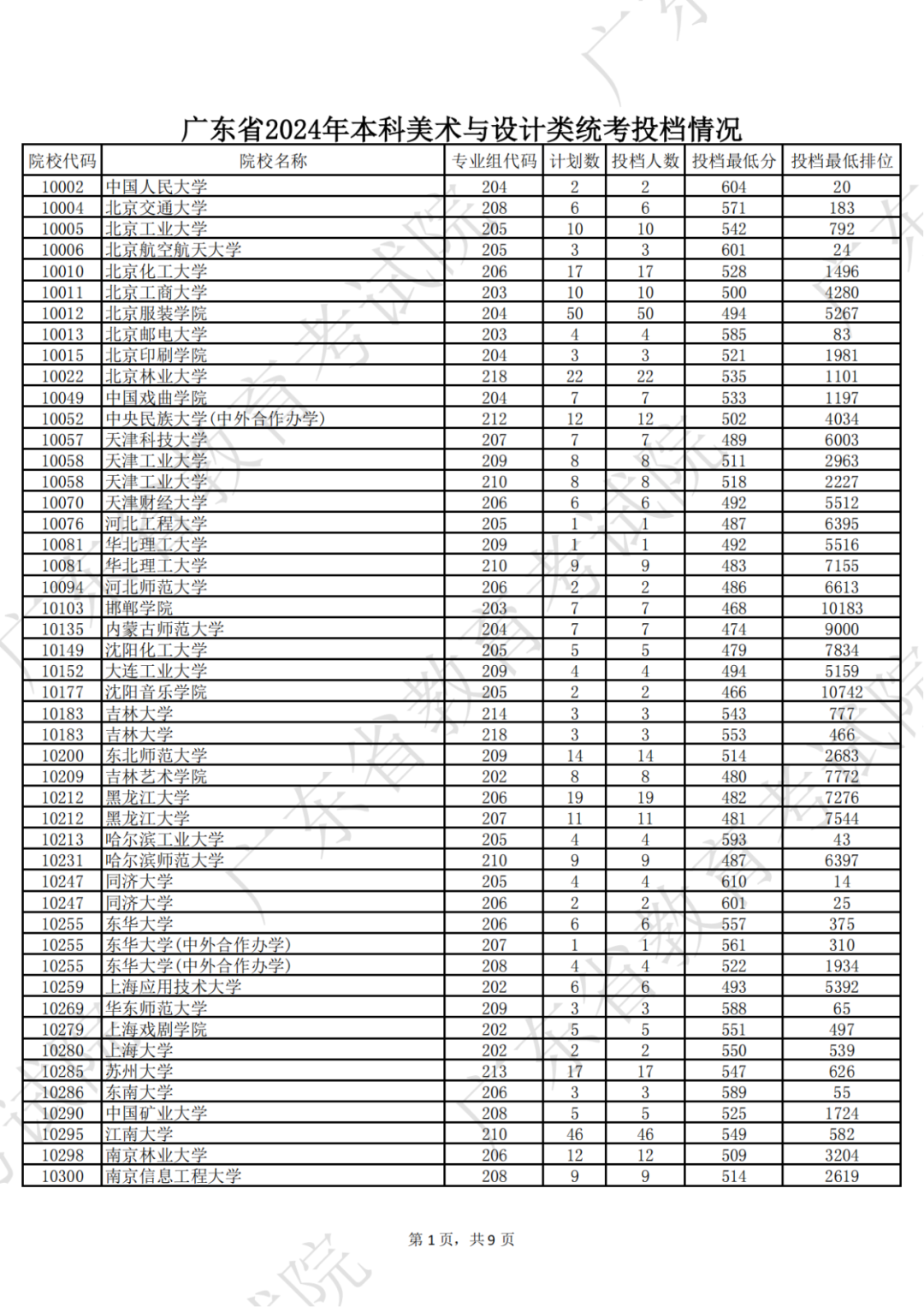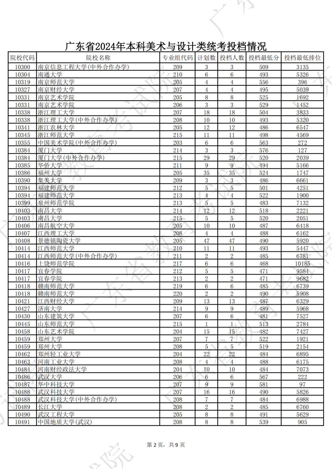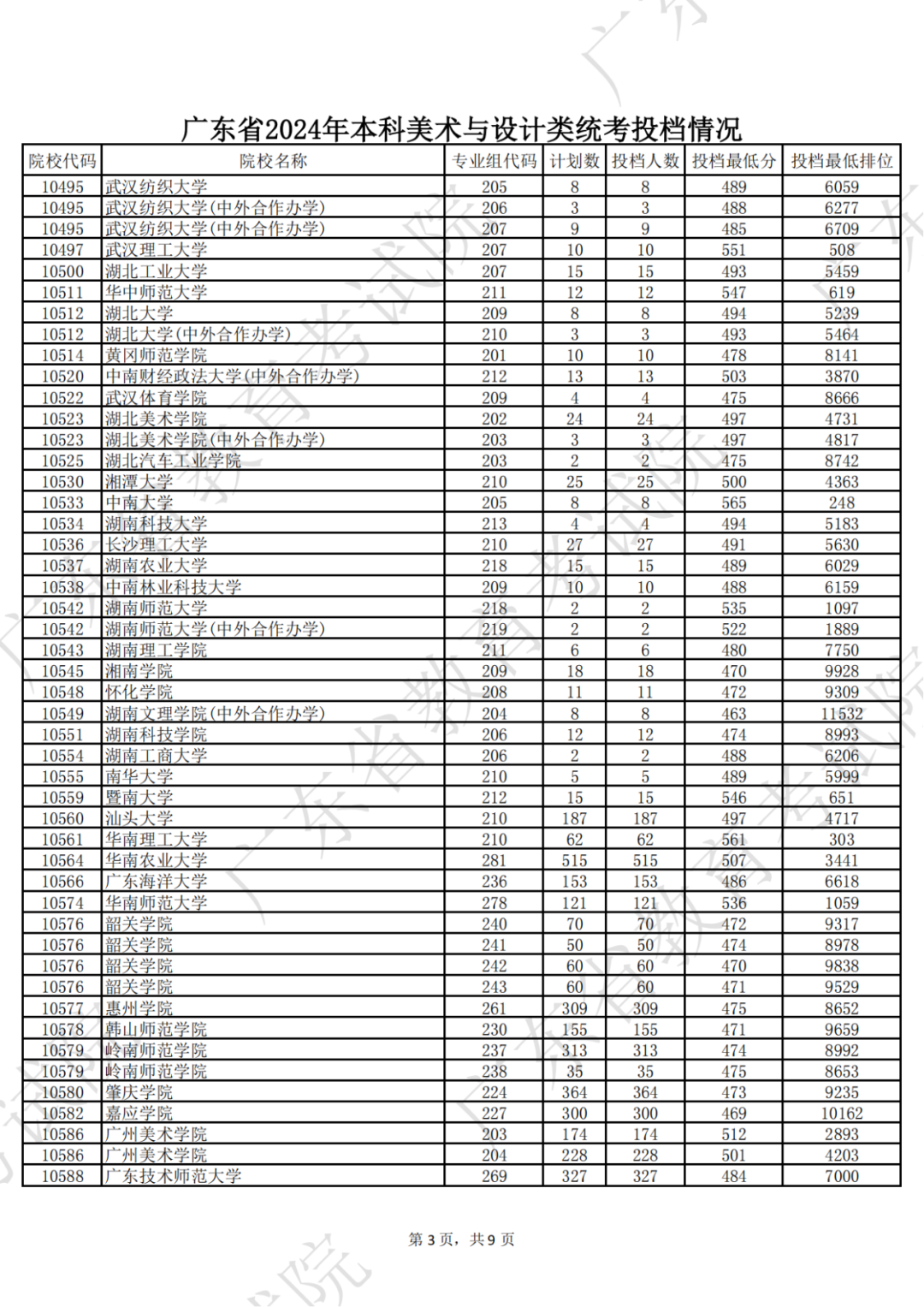 广东省2024年本科美术与设计类统考投档情况