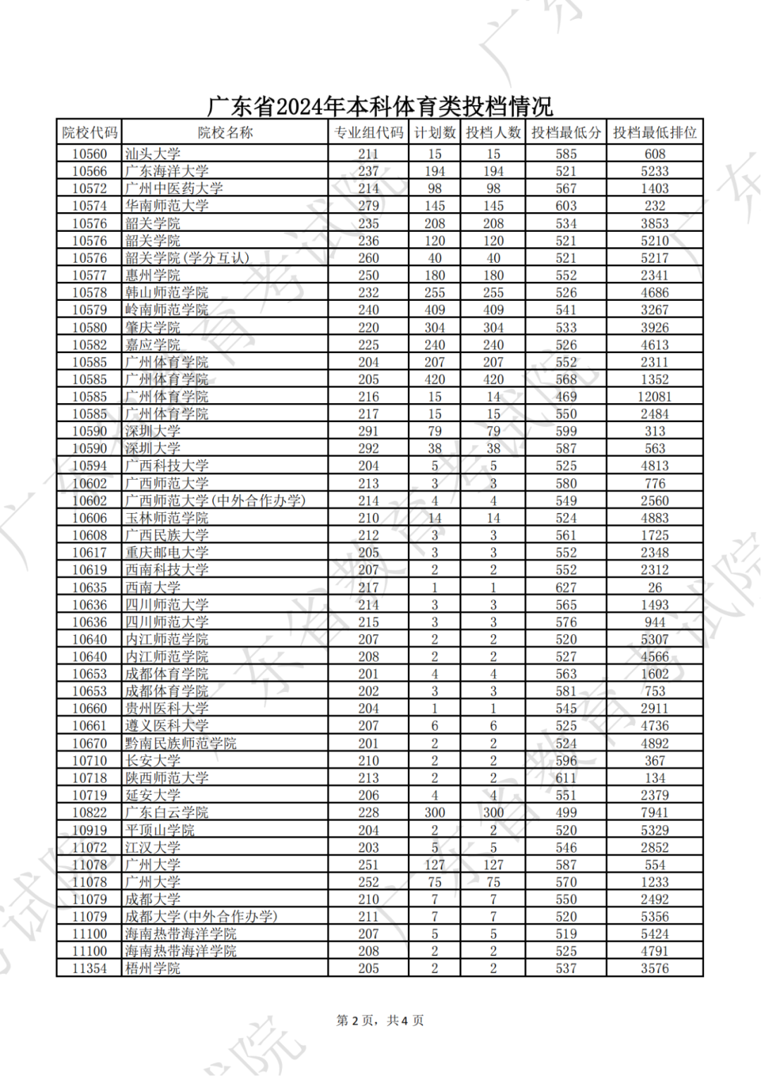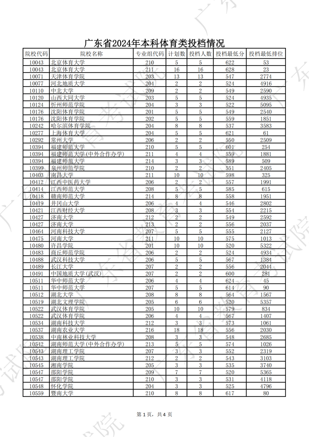 广东省2024年本科体育类投档情况