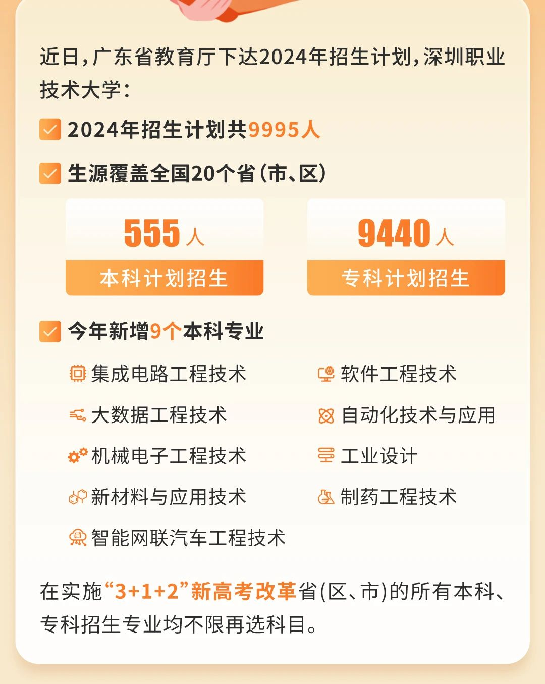 目前来看,面向3+证书进行本科招生的院校依旧仅有9所,虽然今年本科批次有所扩招,但整体招生计划不大,对于3+证书考生来说就是杯水车薪,而深职大和广轻大在升本后如果能面向3+证书招本科生,那对中职生来说确实是个好消息~