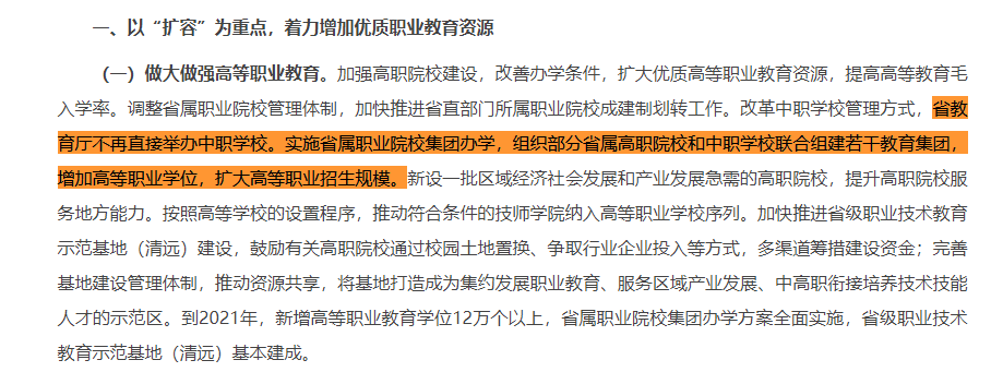 据悉,早在2015年,广东省教育厅印发《厅属职业院校中高职一体化改革实施方案》,实施厅属职业院校中高职一体化改革,逐步将具备条件的中职学校调整为对应高职院校的直属机构。并且,2019年广东省人民政府办公厅印发《广东省职业教育“扩容、提质、强服务”三年行动计划(2019-2021年)的通知》,明确指出:省教育厅不再直接举办中职学校。实施省属职业院校集团办学,组织部分省属高职院校和中职学校联合组建若干教育集团,增加高等职业学位,扩大高等职业招生规模。