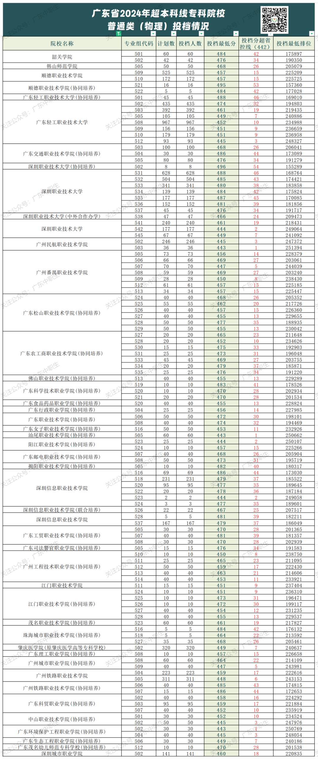 物理类更是有37所广东专科院校的159个专业组超本科省控线,可以看出竞争要比历史类更强。其中,物理类最高的还属深职大的502专业组,最低投档分496分,超出本科省控线54分!
