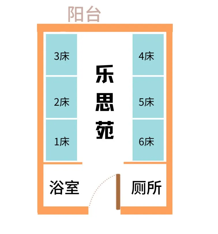 六人间床位排列顺序为:靠门左手边床位为1号,靠门右手边为6号,3号与4号靠近阳台。