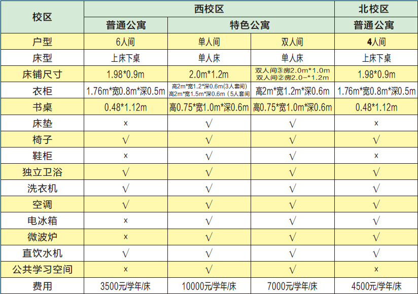 另外西校区设立特色公寓单人间和双人间供学生选择。