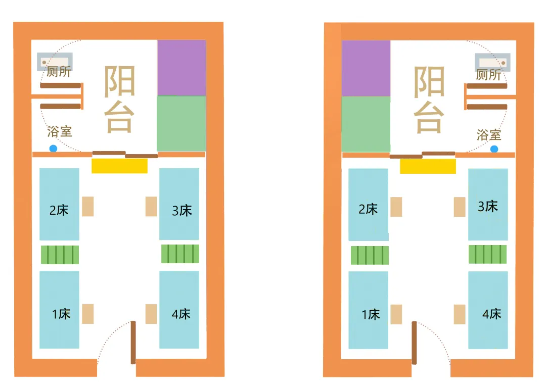 床位排列顺序为:靠门左手边床位为1号,靠门右手边为4号,2号与3号靠近阳台。