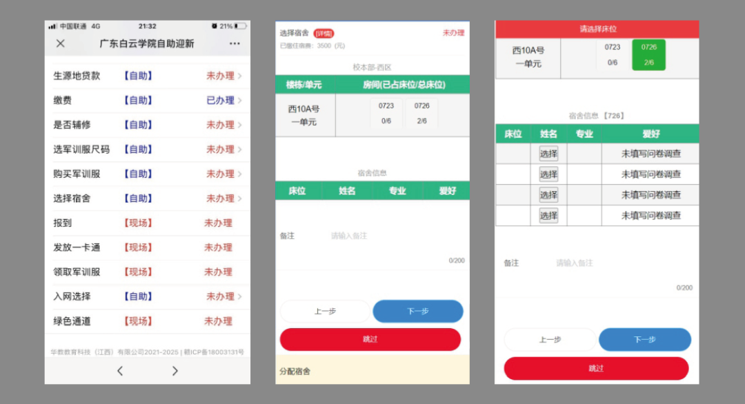 西校区学生公寓(乐思苑)统一为六人间、均采取上床下桌的个人空间形式。宿舍内均配有风扇和空调。