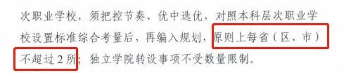 ◆ 教育部2021年8月发布《关于开展“十四五”时期高等学校设置规划编制工作的通知》提到,拟升格的师范、医学、公安高等专科学校,须为2006年及以前审批设立,原则上每个类型每省(区、市)不超过1所;拟设立的本科层次职业学校,须把控节奏、优中选优,对照本科层次职业学校设置标准综合考量后,再编入规划,原则上每省(区、市)不超过2所;独立学院转设事项不受数量限制。