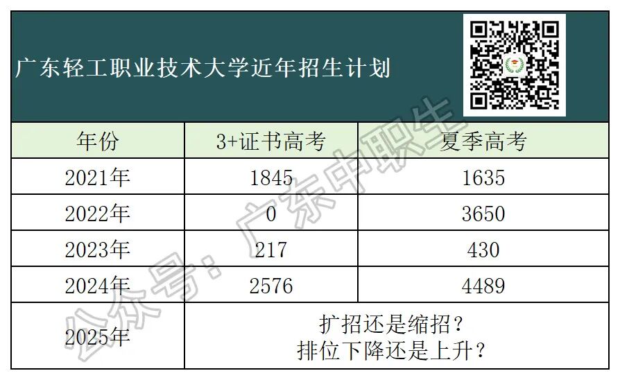 这里统计了广轻工近2年的招生计划,发现今年升为本科之后,无论是3+证书高考,还是夏季高考,广轻工的招生计划都扩招了10倍!而且是近4年来招生人数最多的!