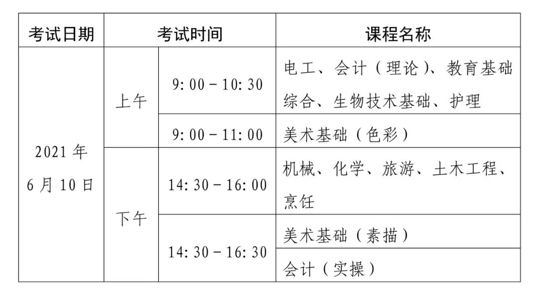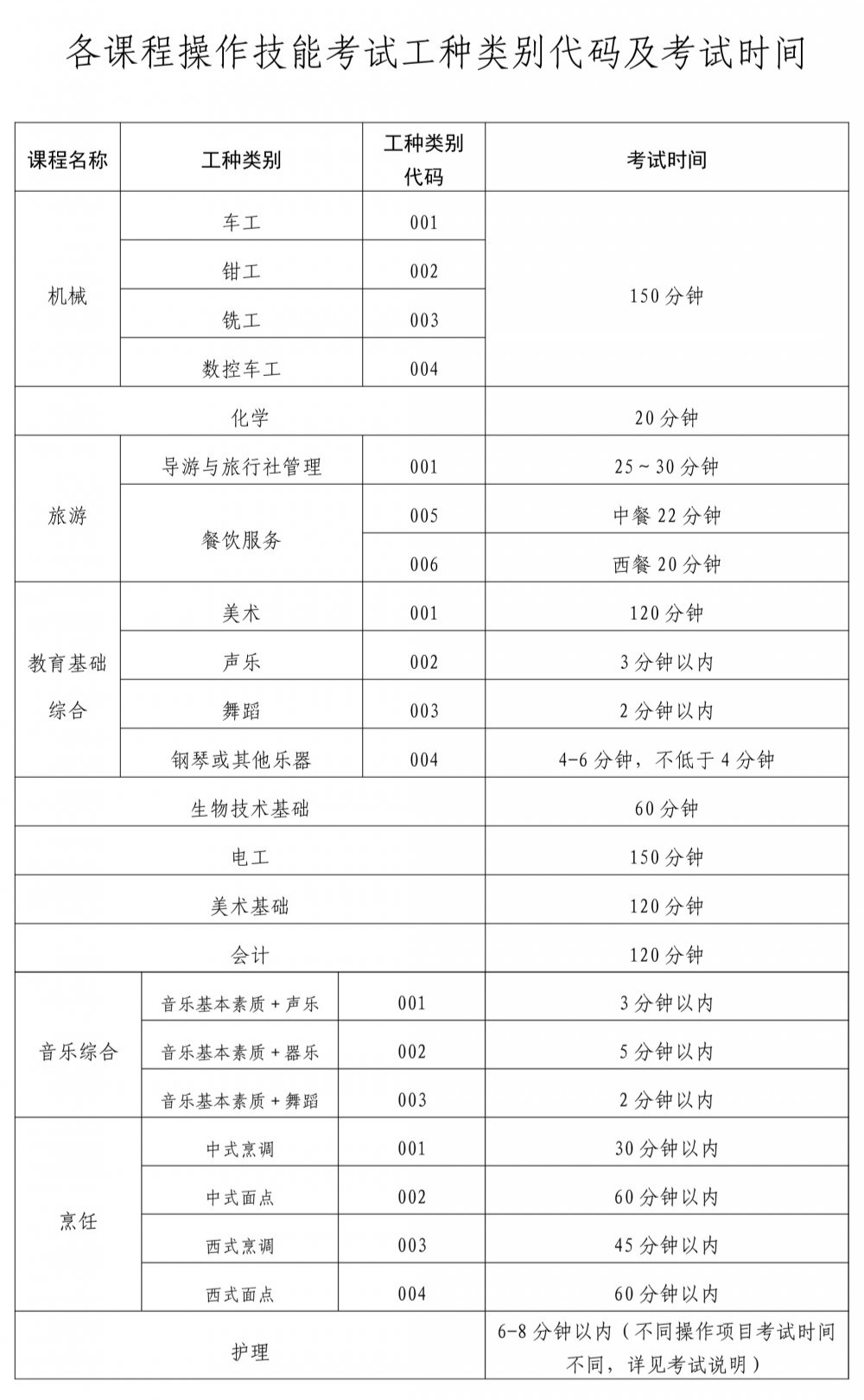 2.电工、机械、化学、教育基础综合(声乐、舞蹈、钢琴)、旅游、生物技术基础、护理、烹饪等课程的操作技能考试时间安排在2021年5月22日-23日进行(具体考试时间以准考证为准)。